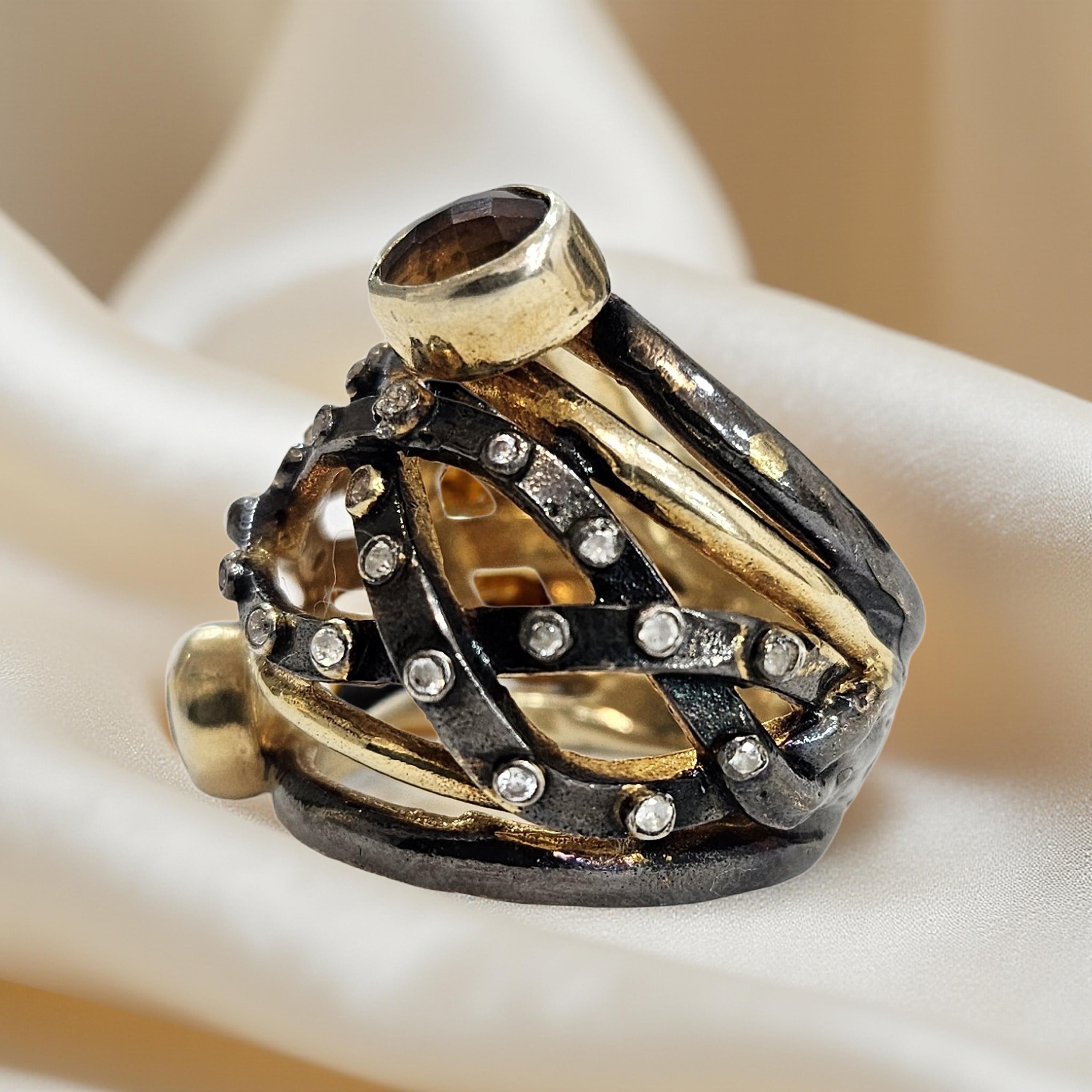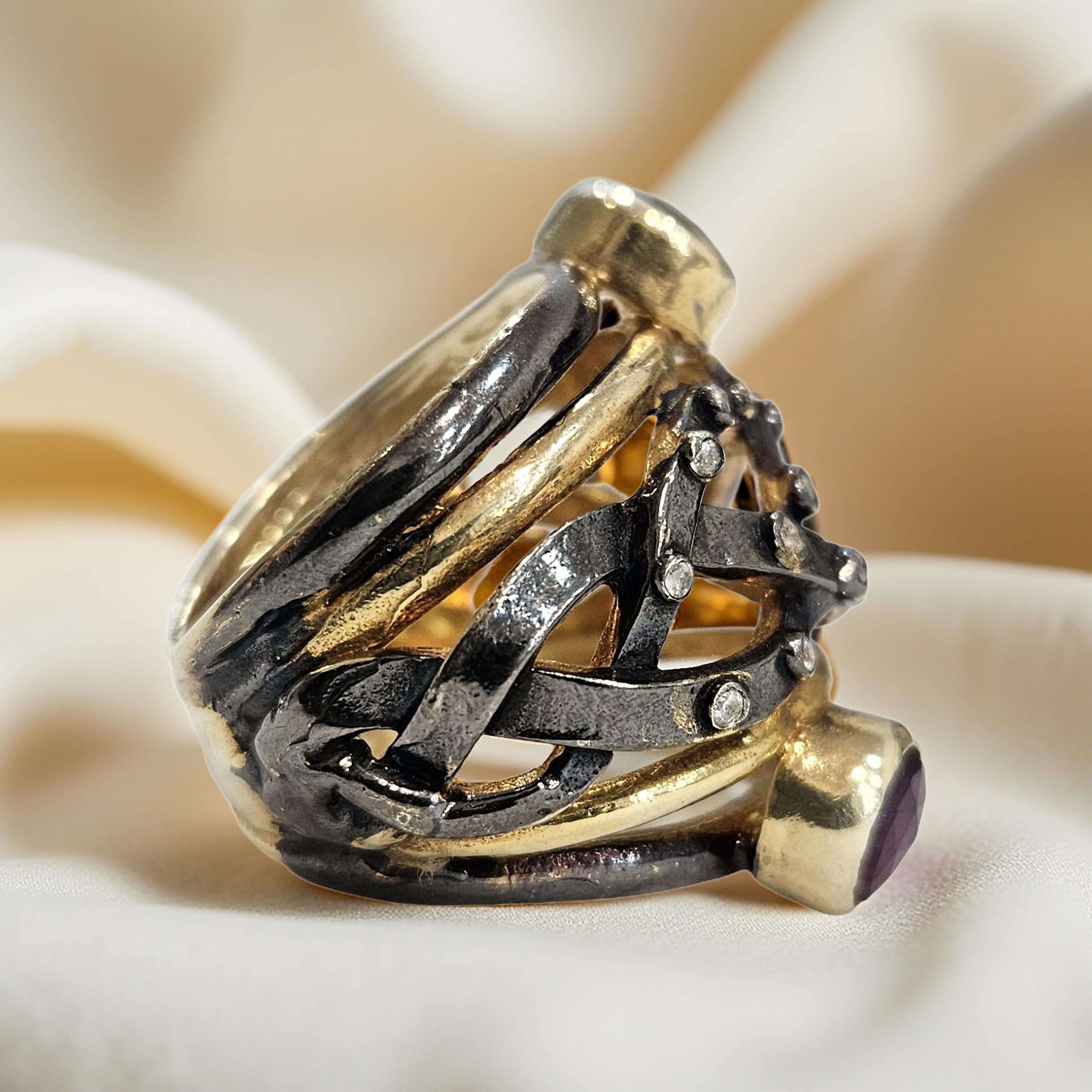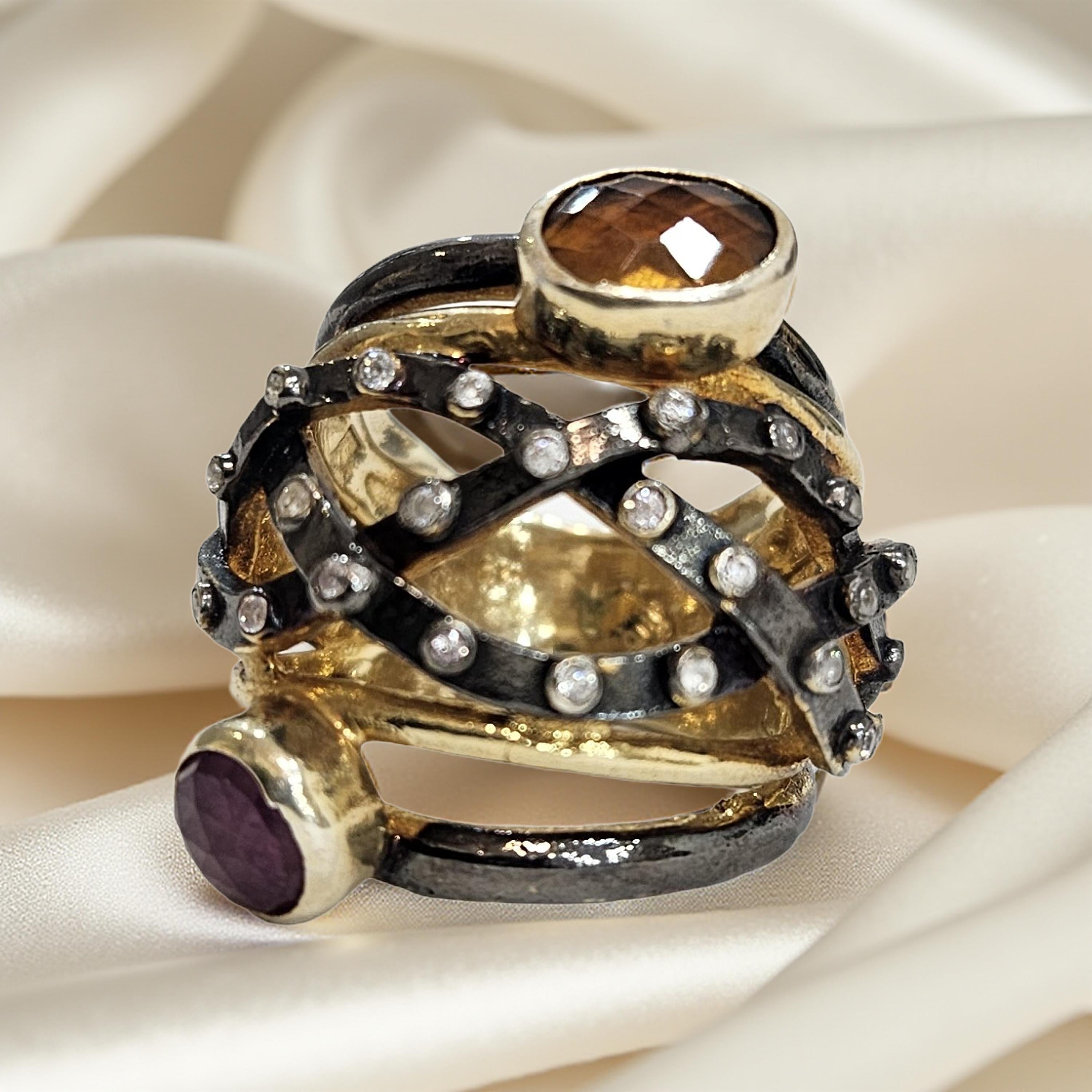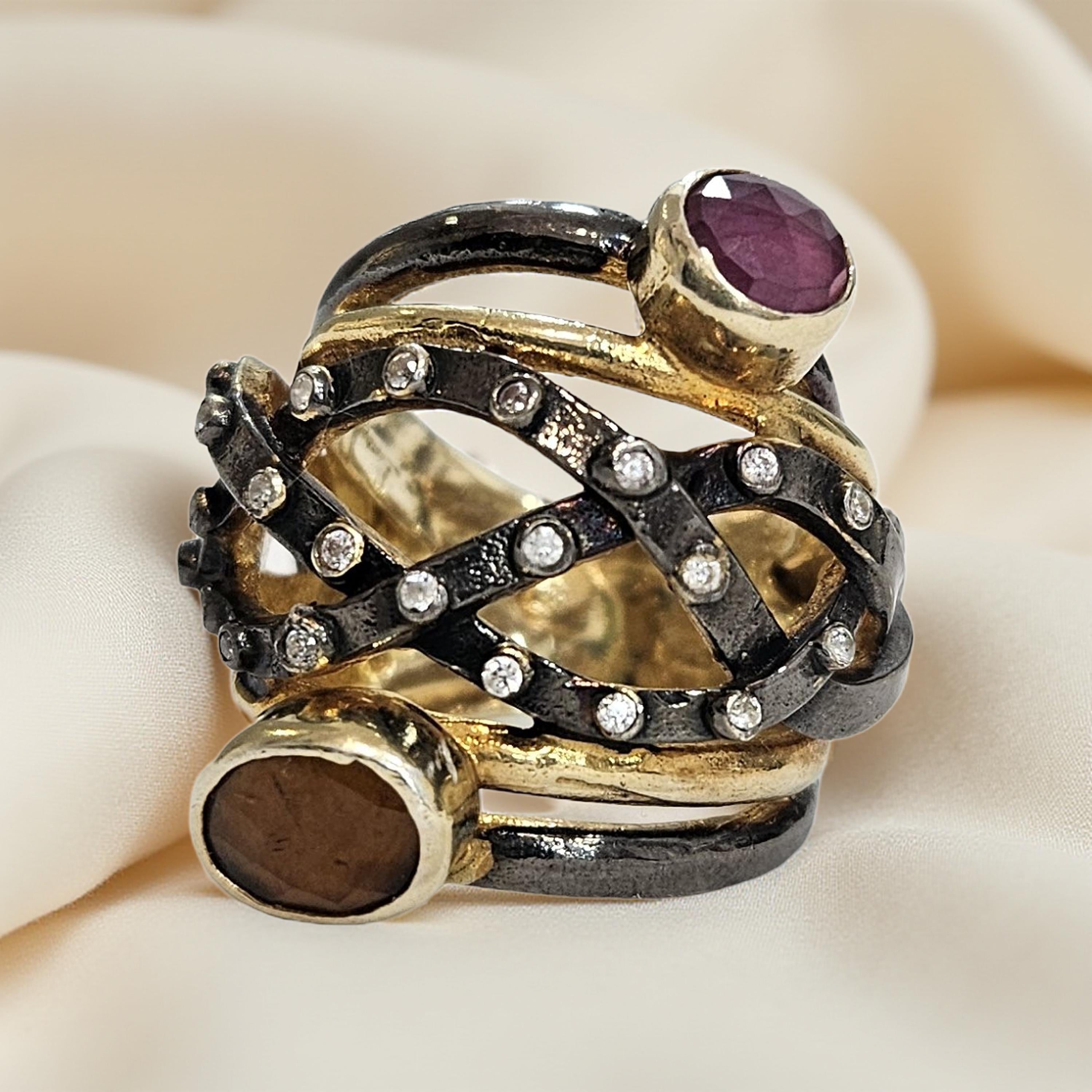 Bague en argent 925 rhodié et plaqué or, multi-pierres semi-précieuses