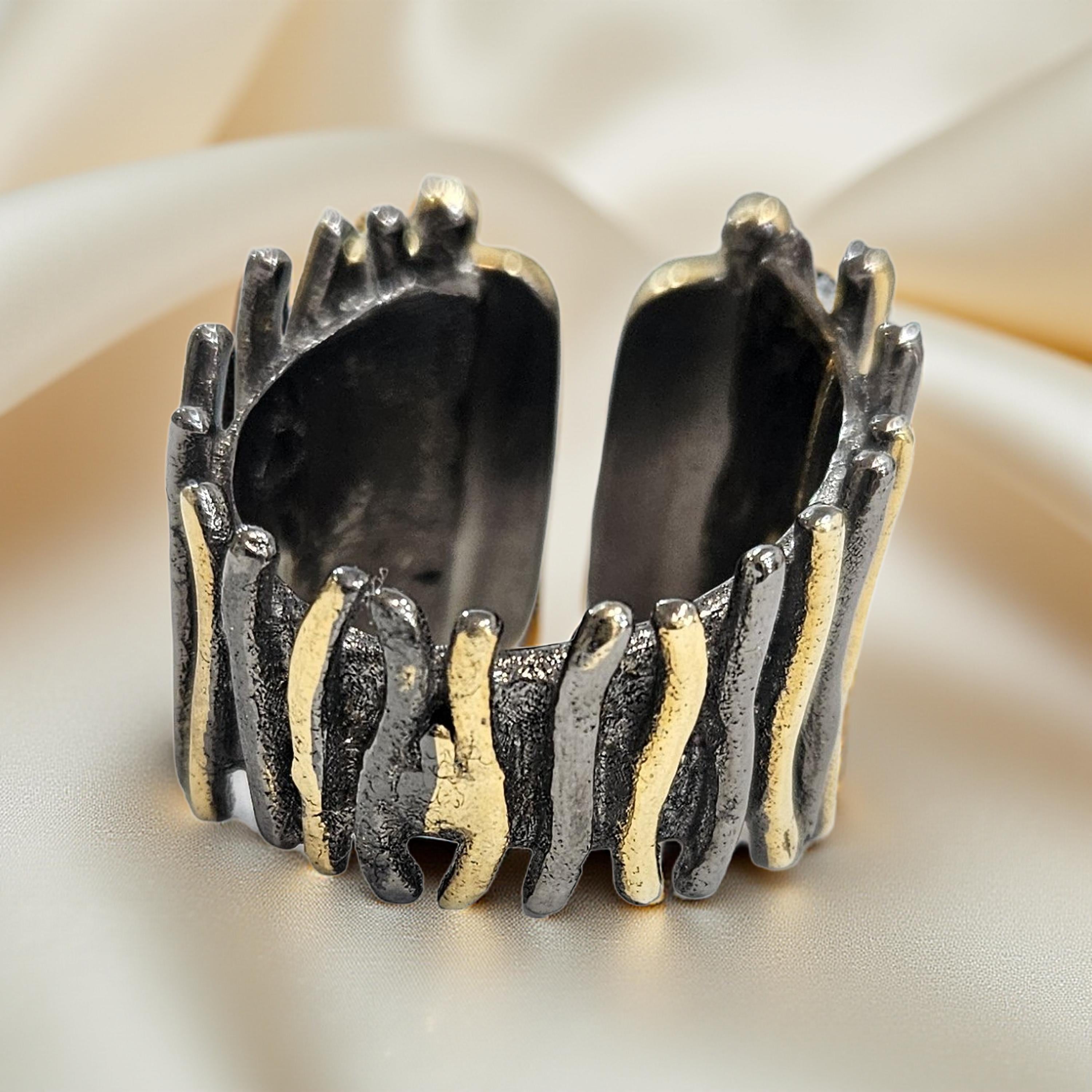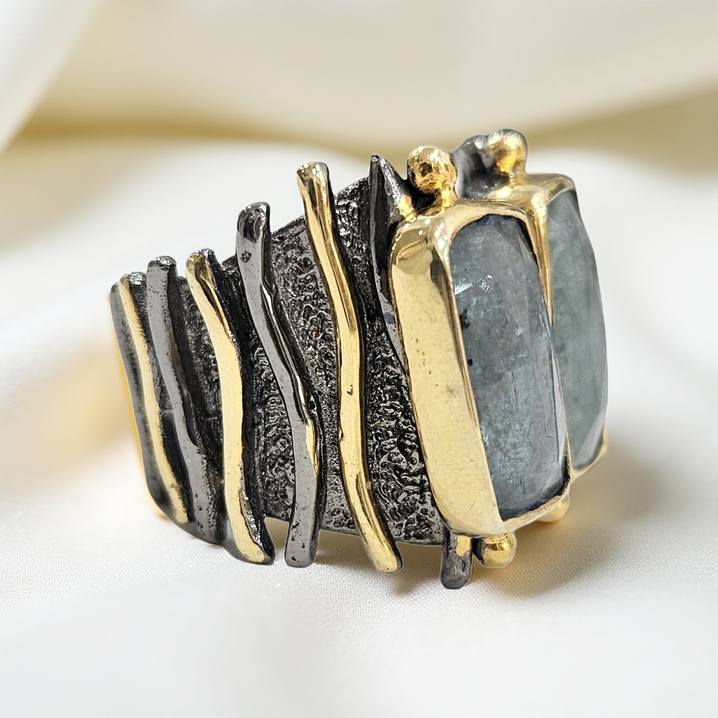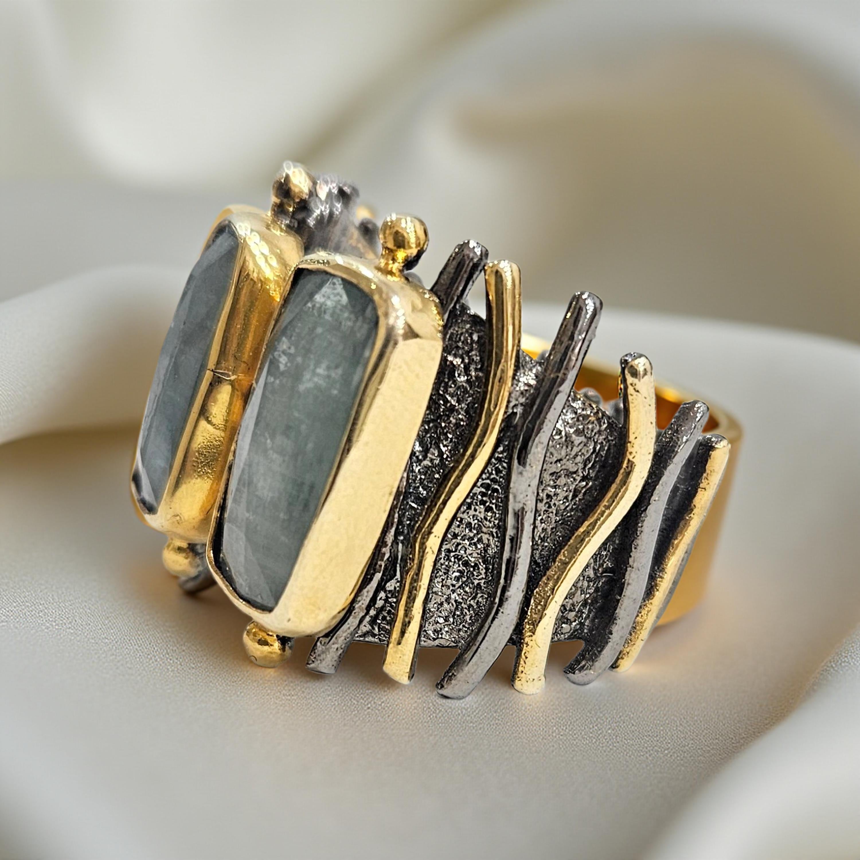Cette bague en argent 925 rhodié et plaqué or est ornée de deux pierres cyanite bleues, créant un design unique et artisanal. Fabriquée à la main, elle apporte une touche d'élégance et de sophistication à votre tenue. Son alliance de matériaux précieux et de pierres naturelles en font un bijou à la fois moderne et intemporel.