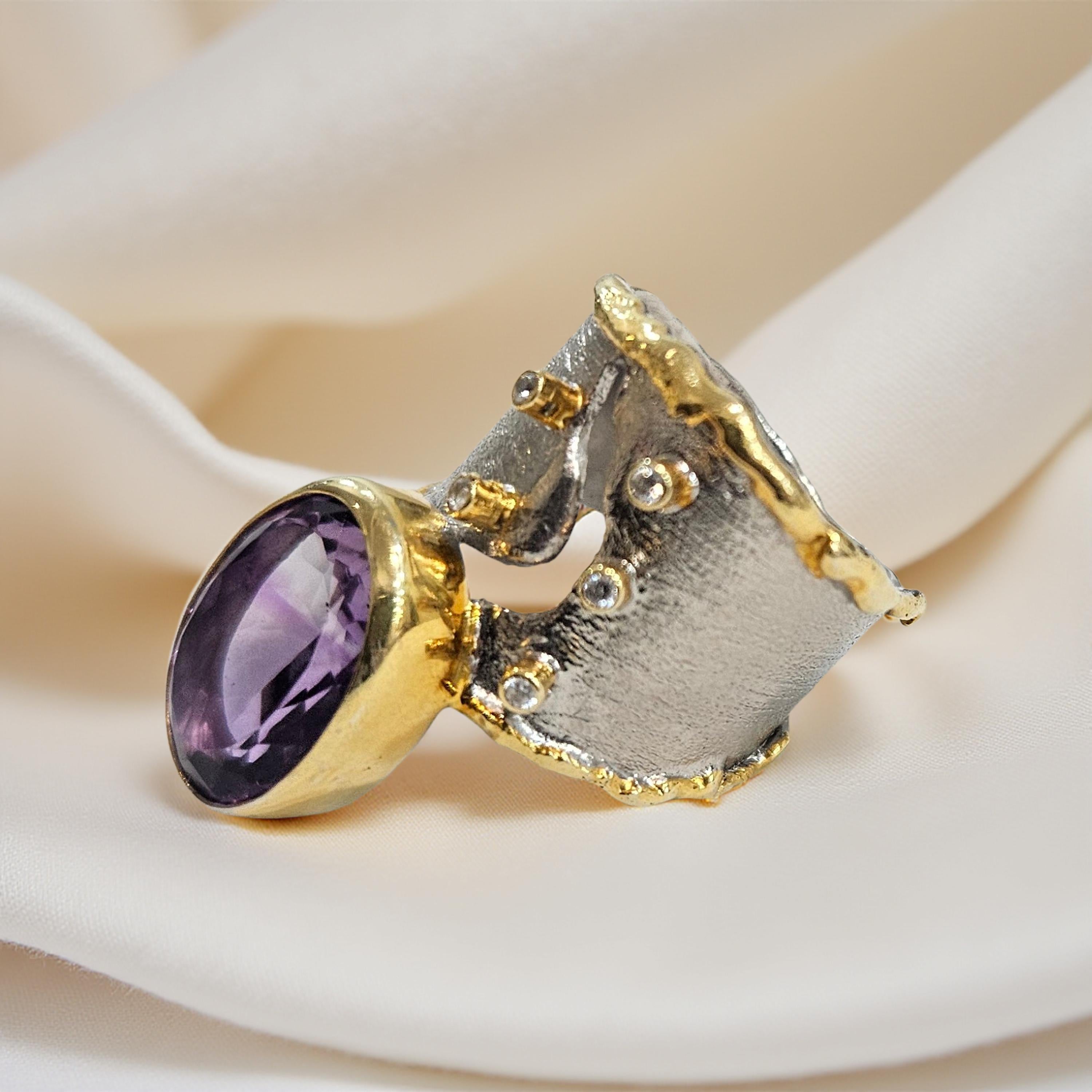 Bague artisanale en argent 925 plaqué or, au design contemporain et texturé, évoquant une pièce façonnée à la main. En son cœur, une améthyste facettée aux reflets violets profonds capte la lumière avec intensité. De délicats zirconiums sertis illuminent la monture et apportent une touche de raffinement. Une création unique au caractère affirmé, mêlant force minérale, authenticité et sophistication.