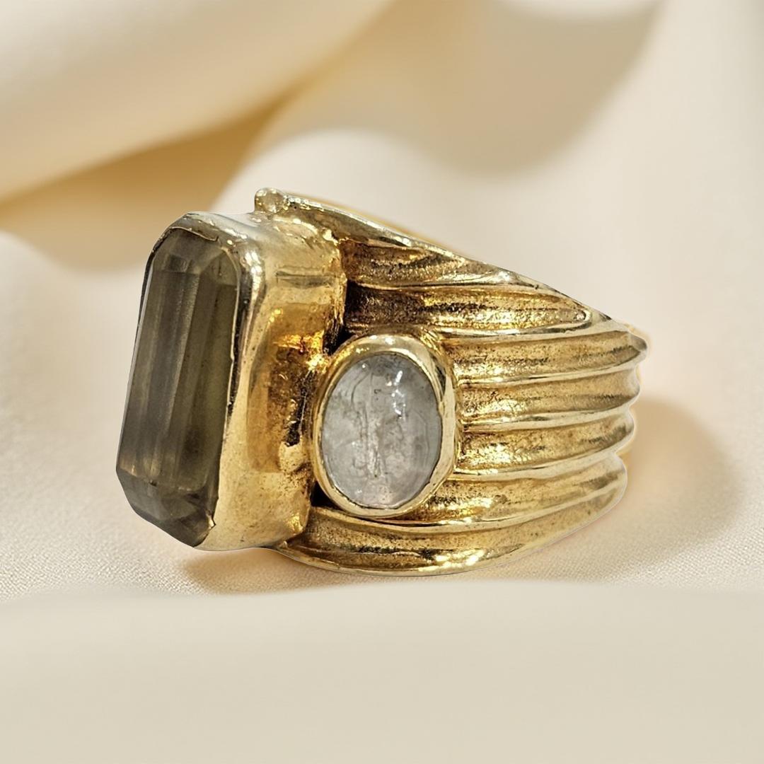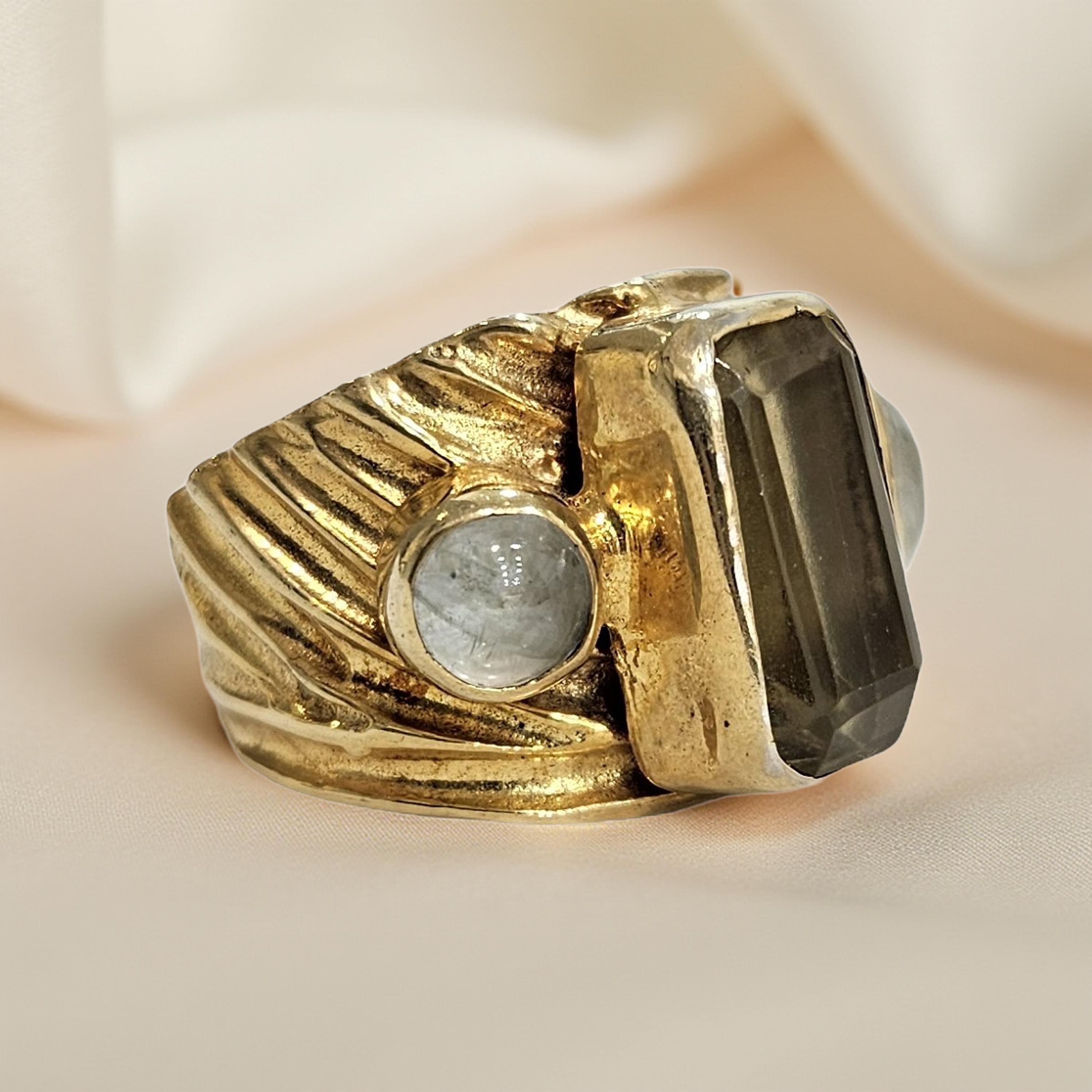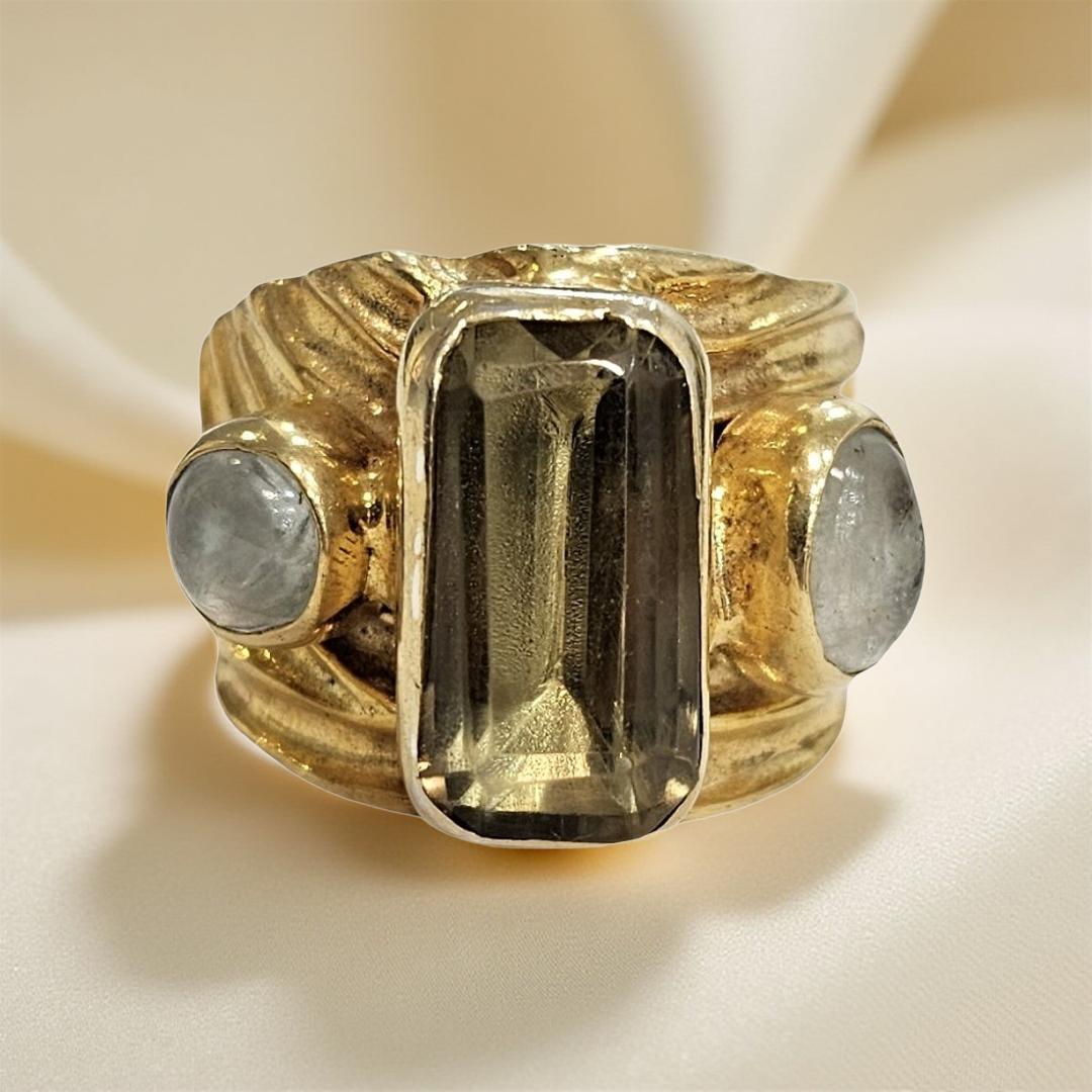 Cette bague artisanale en argent 925 plaqué or se distingue par son caractère affirmé et son design sculptural. Au centre, une citrine taillée en forme rectangulaire capte la lumière avec élégance, révélant des nuances dorées chaleureuses et profondes. Elle est accompagnée de deux cristaux de roche ronds, subtilement positionnés de chaque côté, apportant équilibre, clarté et harmonie à l’ensemble.