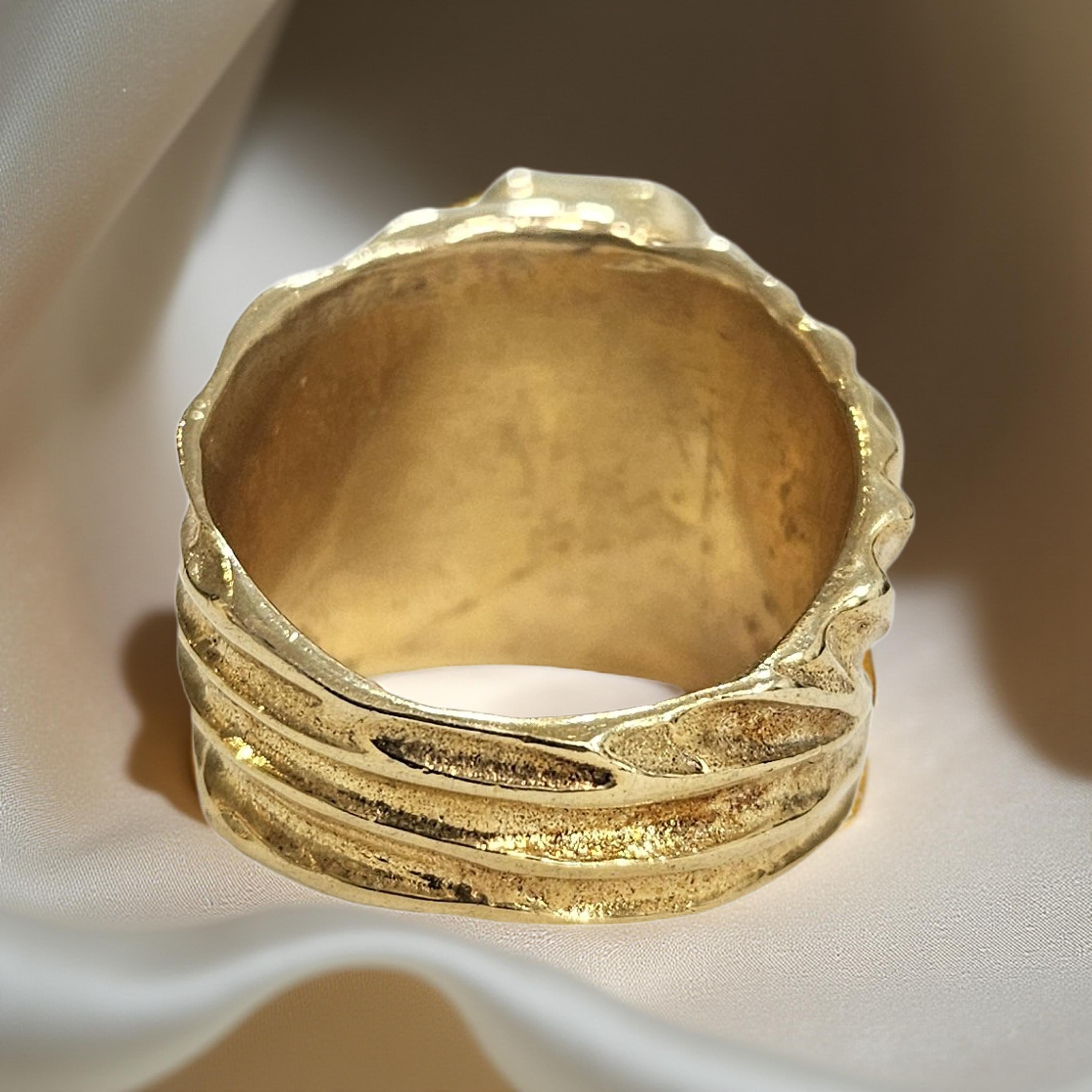 Le corps de la bague, travaillé avec des reliefs texturés et organiques, souligne le savoir-faire artisanal et donne à ce bijou une présence forte et authentique.