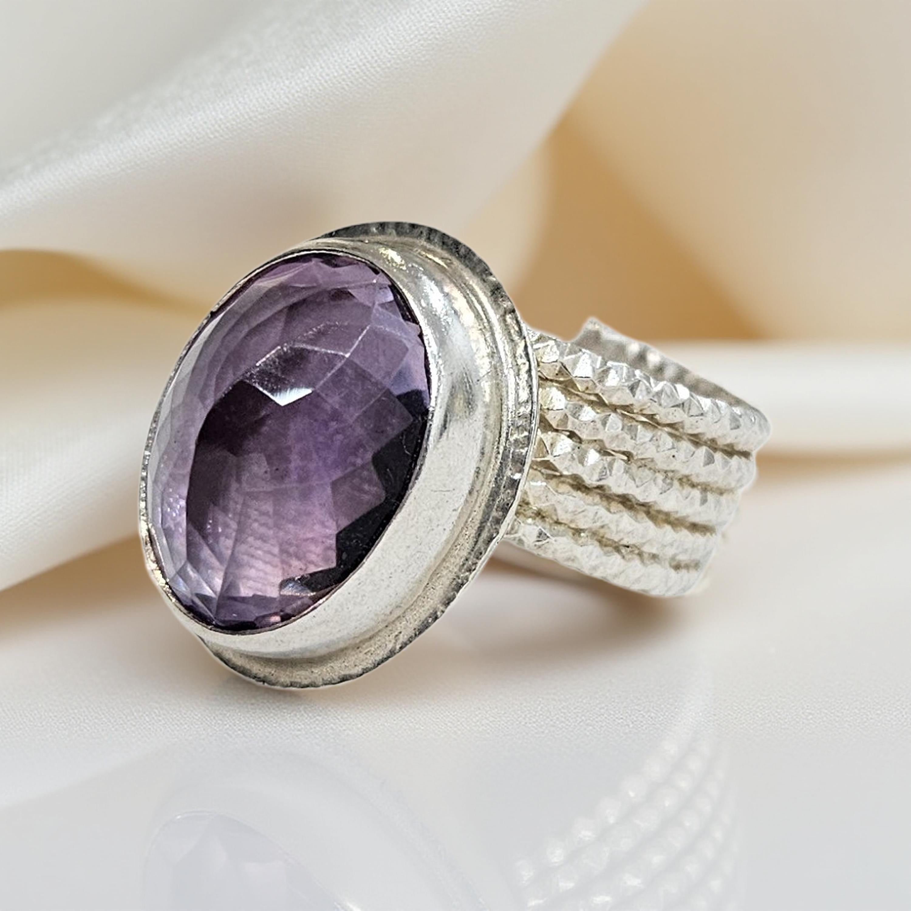 Cette bague en argent 925 met en valeur une améthyste ovale facettée, aux reflets violets profonds et lumineux. La pierre est sertie dans un entourage lisse et épuré, qui souligne sa brillance tout en lui offrant une belle présence.