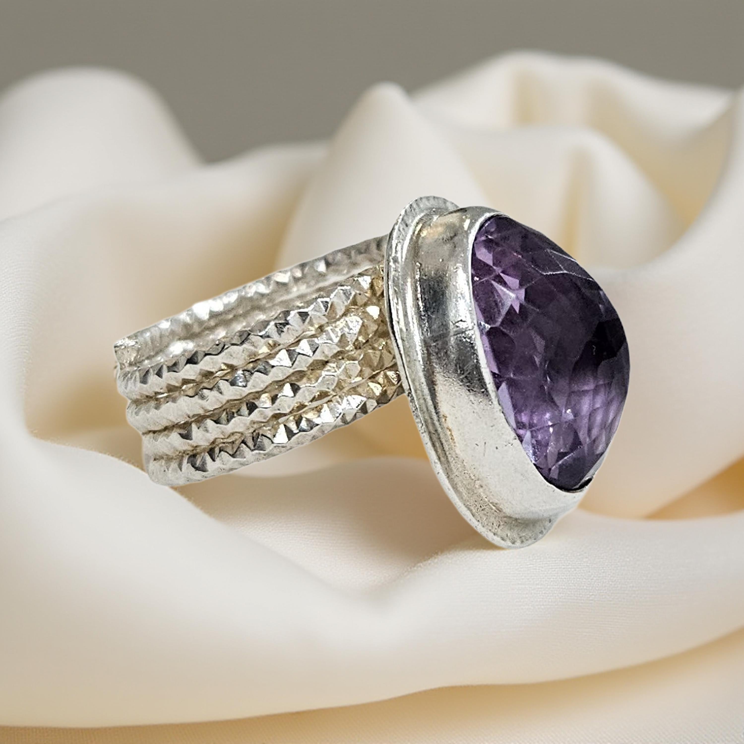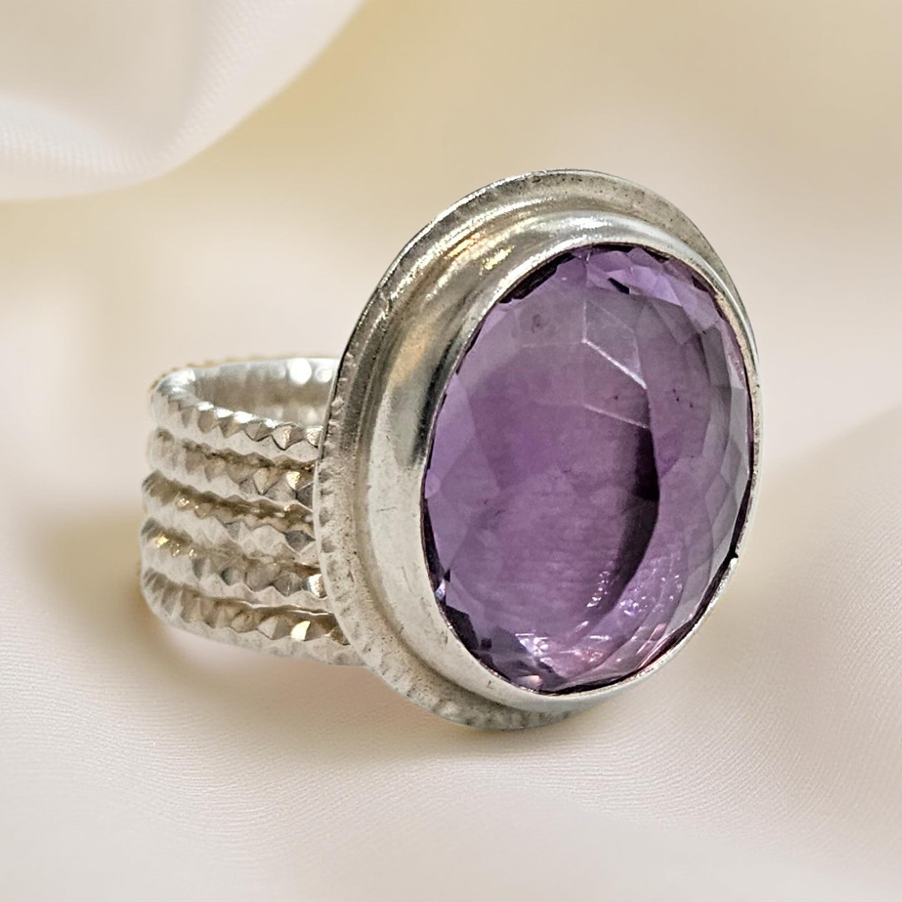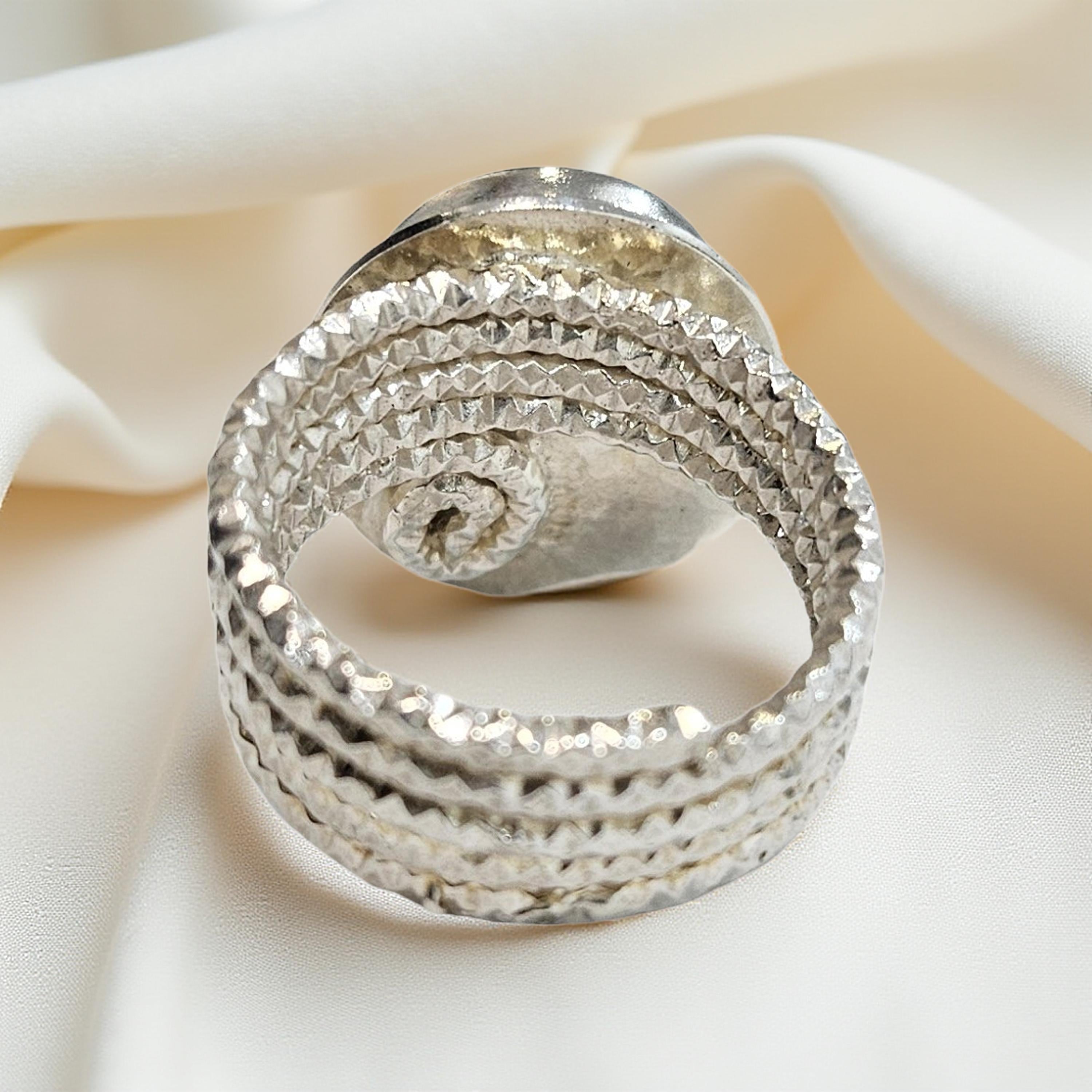 Le corps de la bague se distingue par un travail de texture finement martelé et strié, apportant relief et caractère à l’ensemble. L’équilibre entre la douceur de la pierre et la structure travaillée de l’argent confère à ce bijou un design à la fois élégant, artisanal et intemporel, idéal pour un porté quotidien comme pour une pièce de caractère.