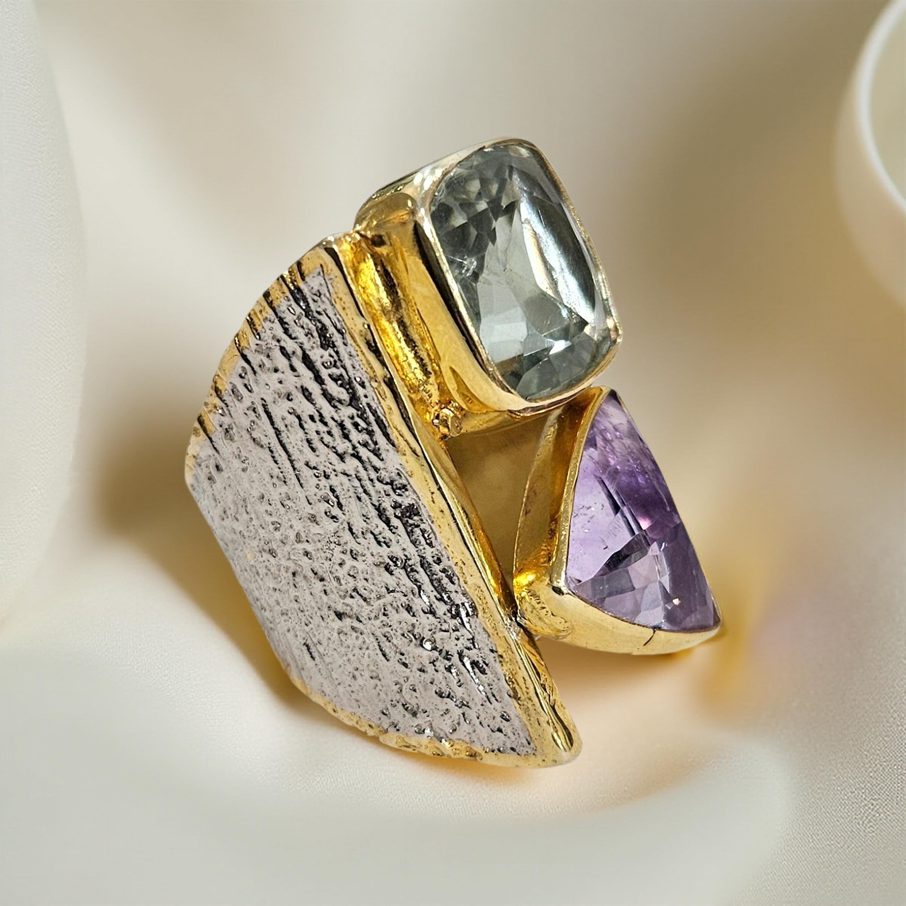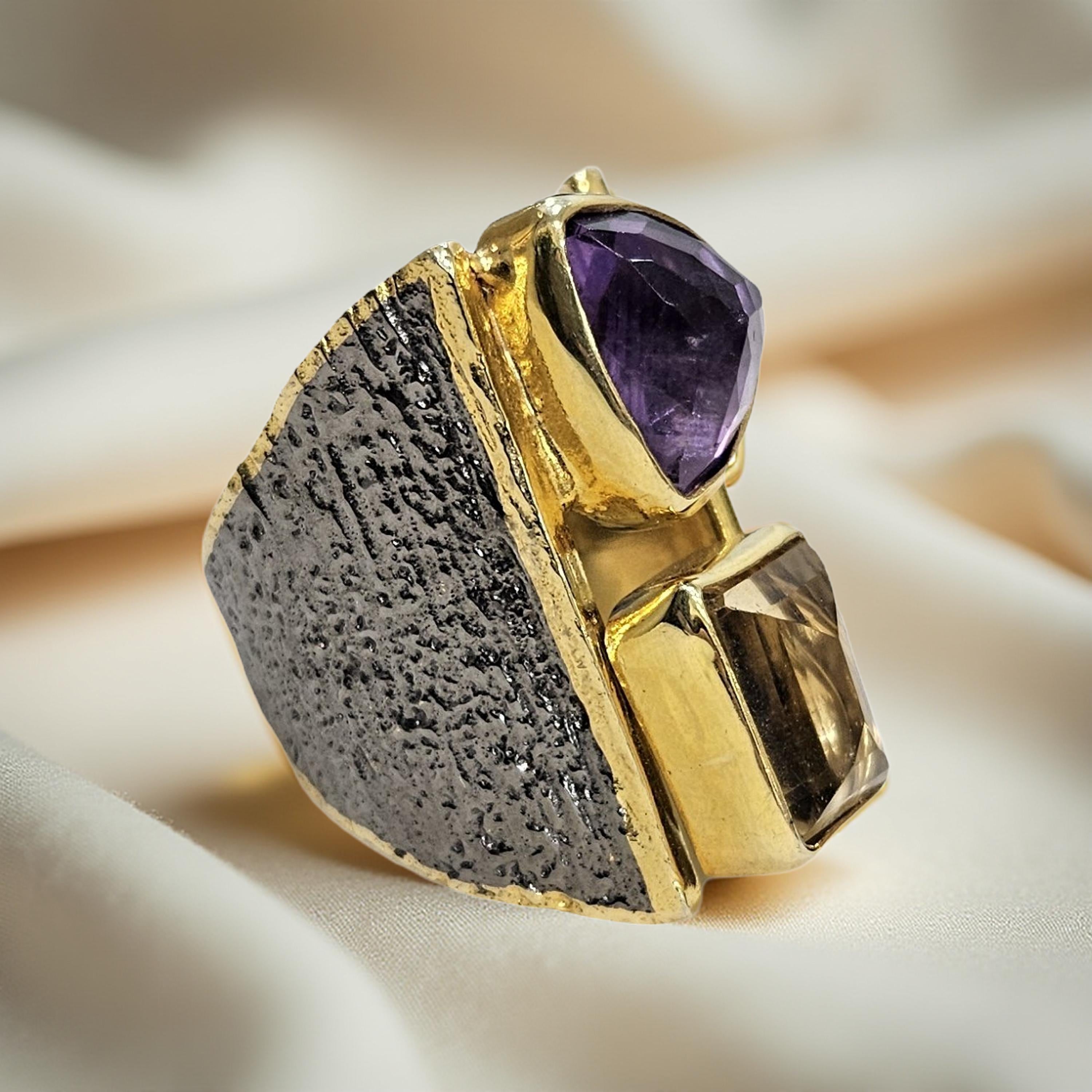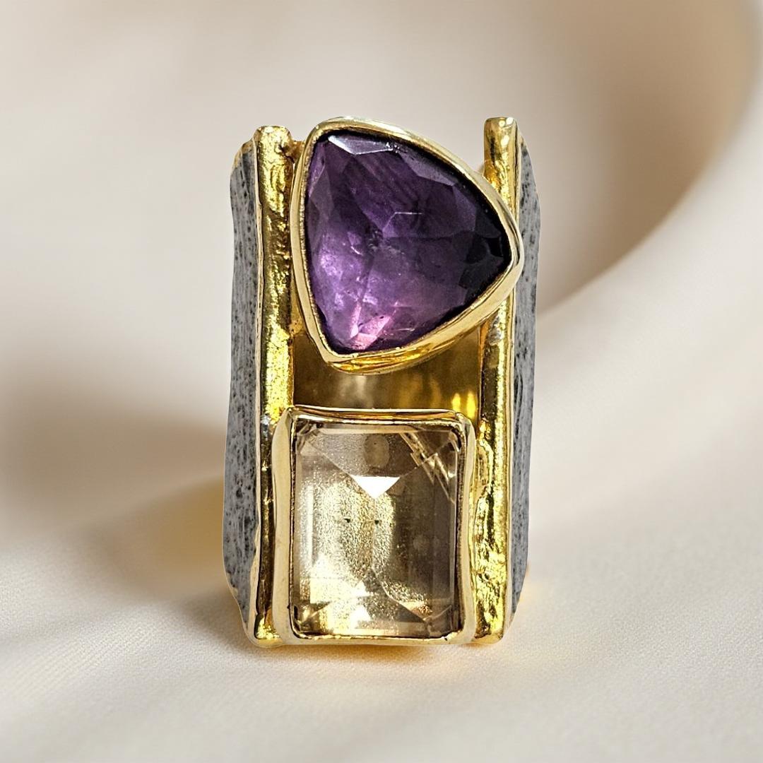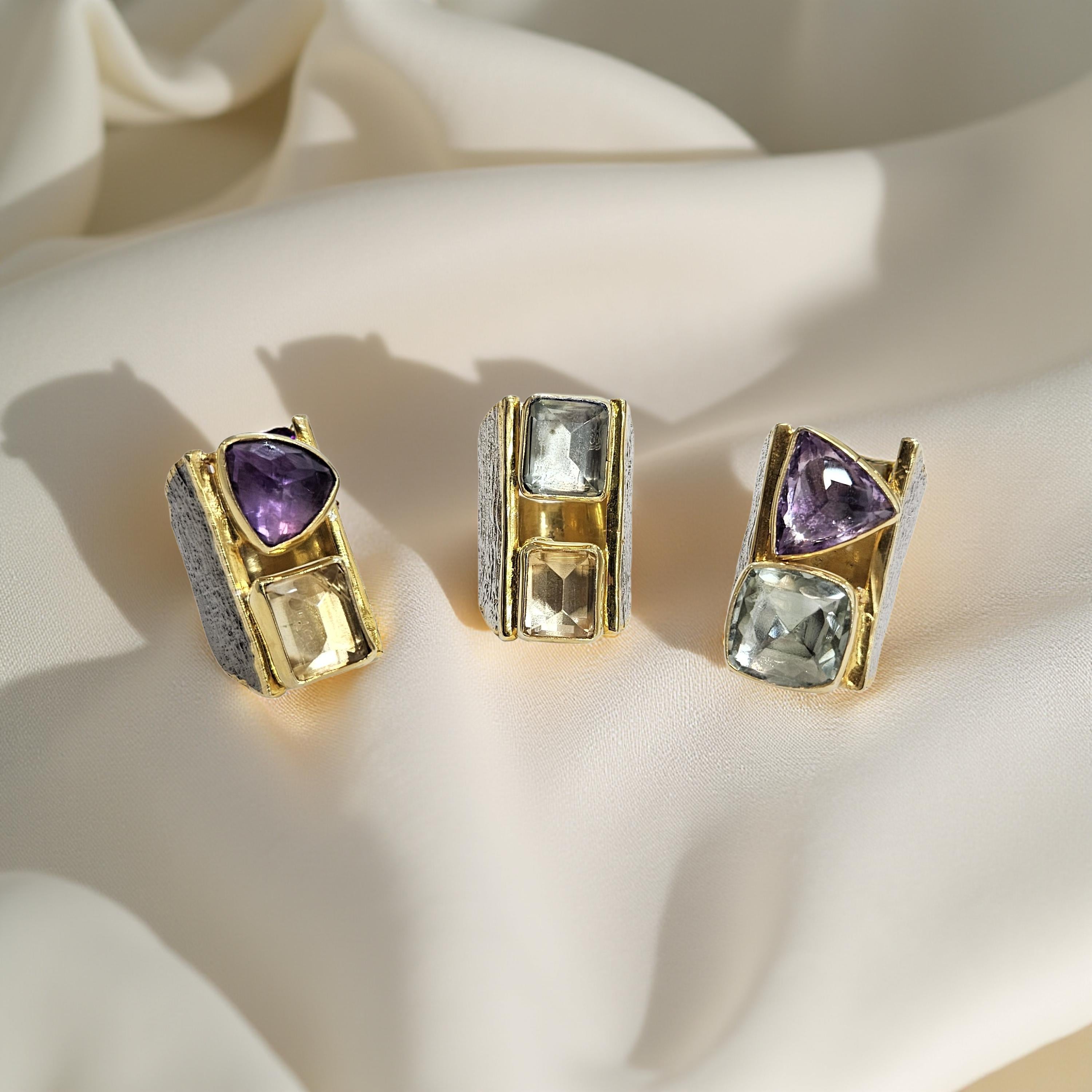 Les pierres naturelles sont mises en valeur par un sertissage net et audacieux : améthyste, améthyste rose de France, citrine et péridot se répondent dans un jeu harmonieux de formes géométriques, associant tailles triangulaires et rectangulaires. Le contraste entre l’éclat doré, l’argent patiné et les nuances lumineuses des pierres crée une pièce élégante et expressive.