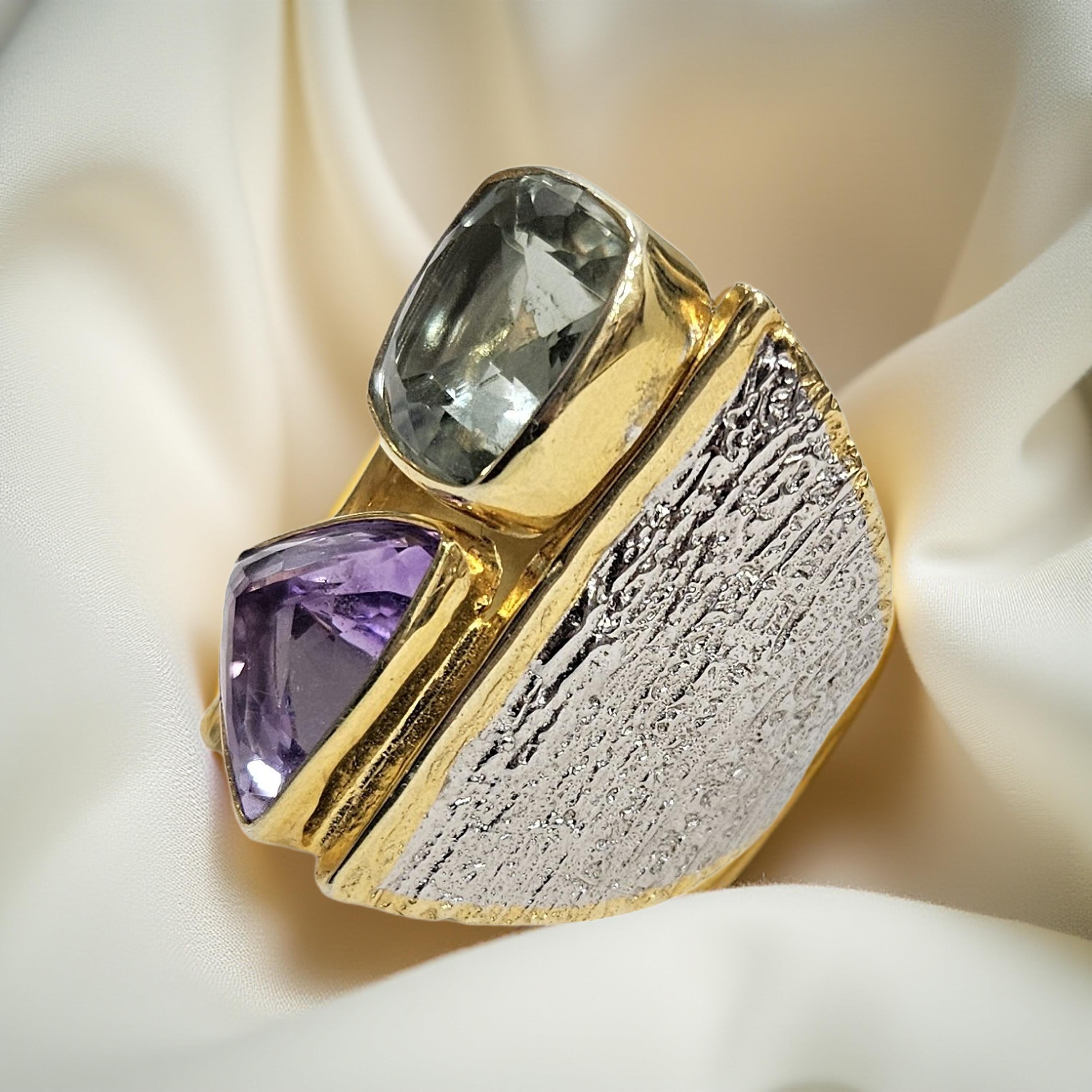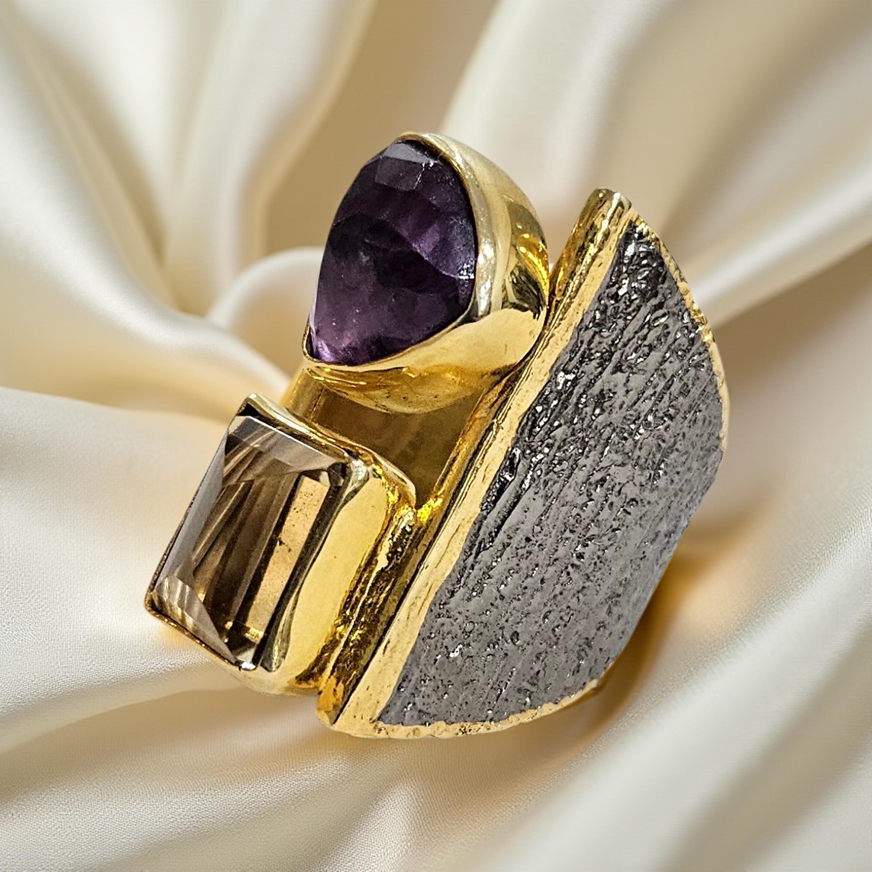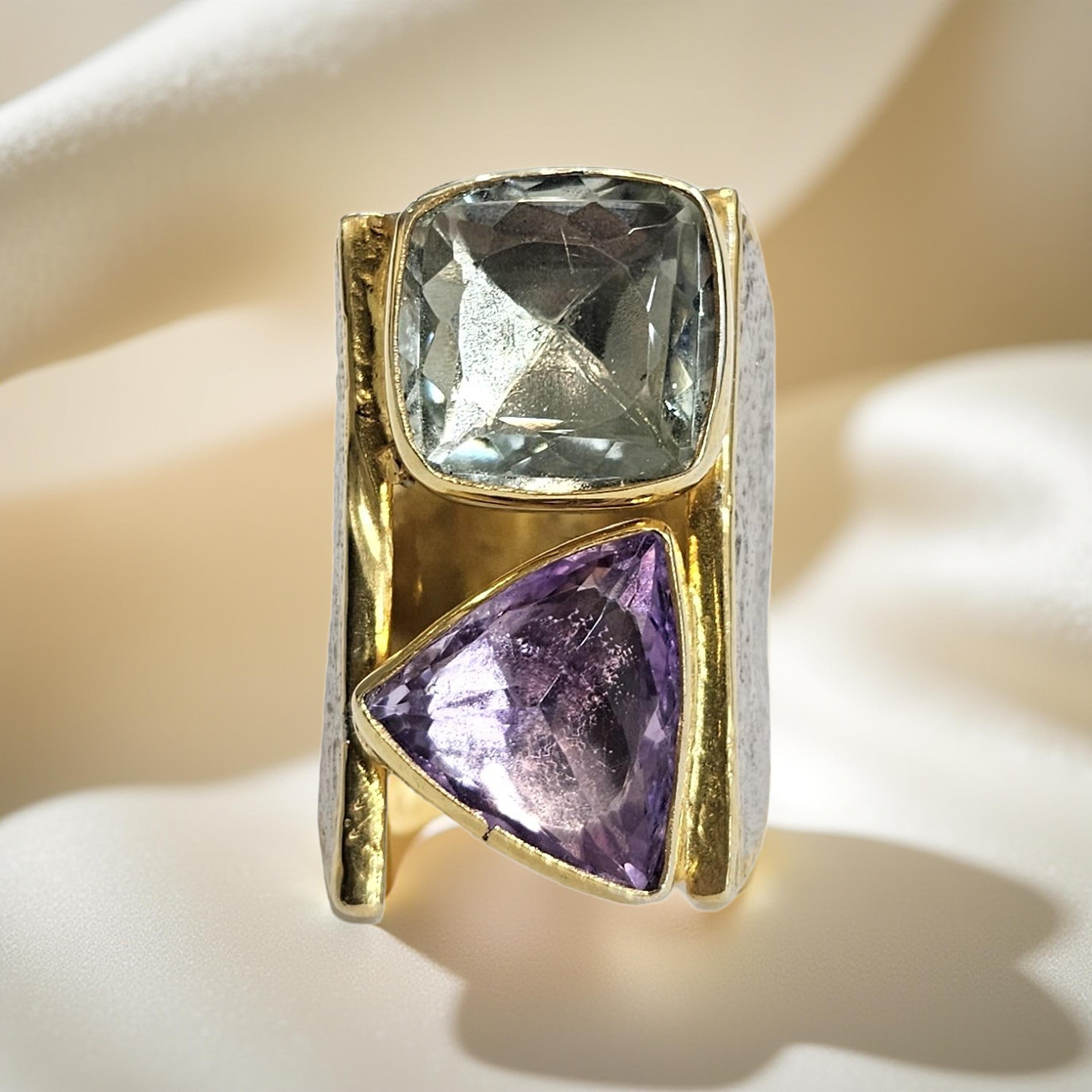 Les pierres naturelles sont mises en valeur par un sertissage net et audacieux : améthyste, améthyste rose de France, citrine et péridot se répondent dans un jeu harmonieux de formes géométriques, associant tailles triangulaires et rectangulaires. Le contraste entre l’éclat doré, l’argent patiné et les nuances lumineuses des pierres crée une pièce élégante et expressive.