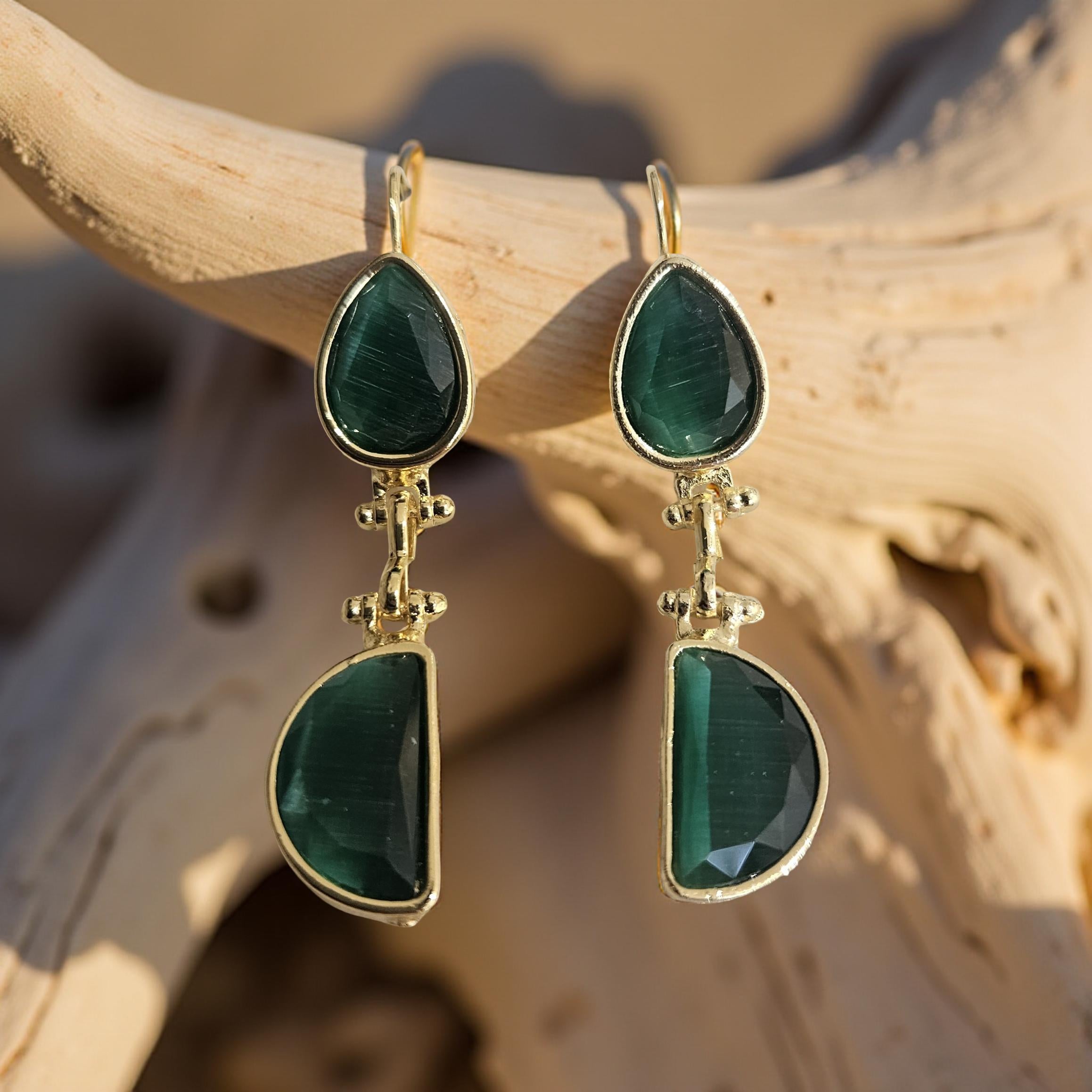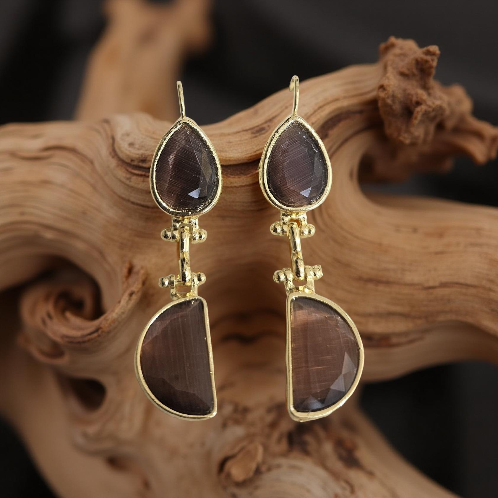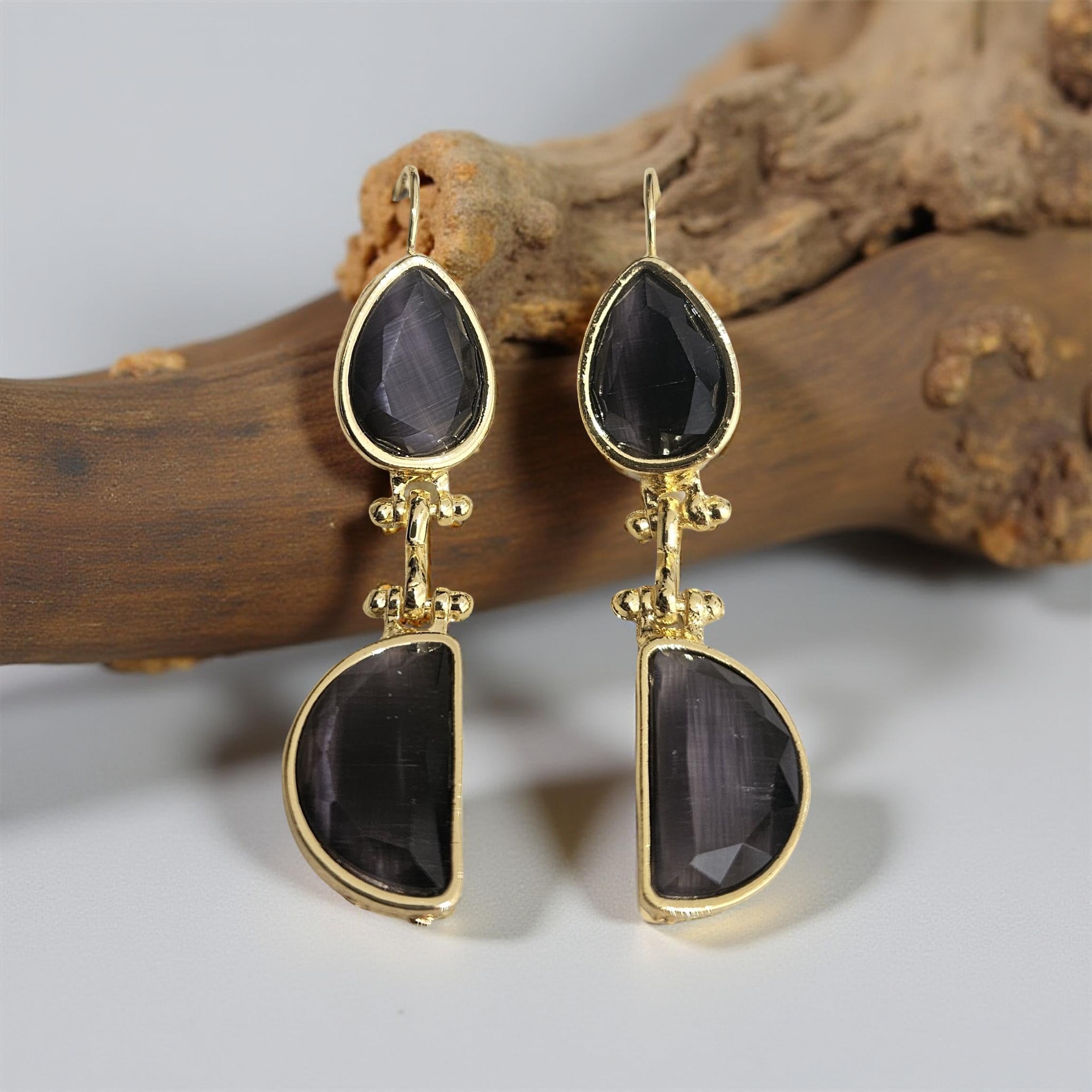 Profitez d'un style unique avec nos Boucles d'oreilles œil de chat. Les pierres en forme de goutte et demi-lune en laiton plaqué or sont disponibles en divers coloris pour compléter votre tenue. Ajoutez une touche d'élégance à votre look avec ces boucles d'oreilles tendance.