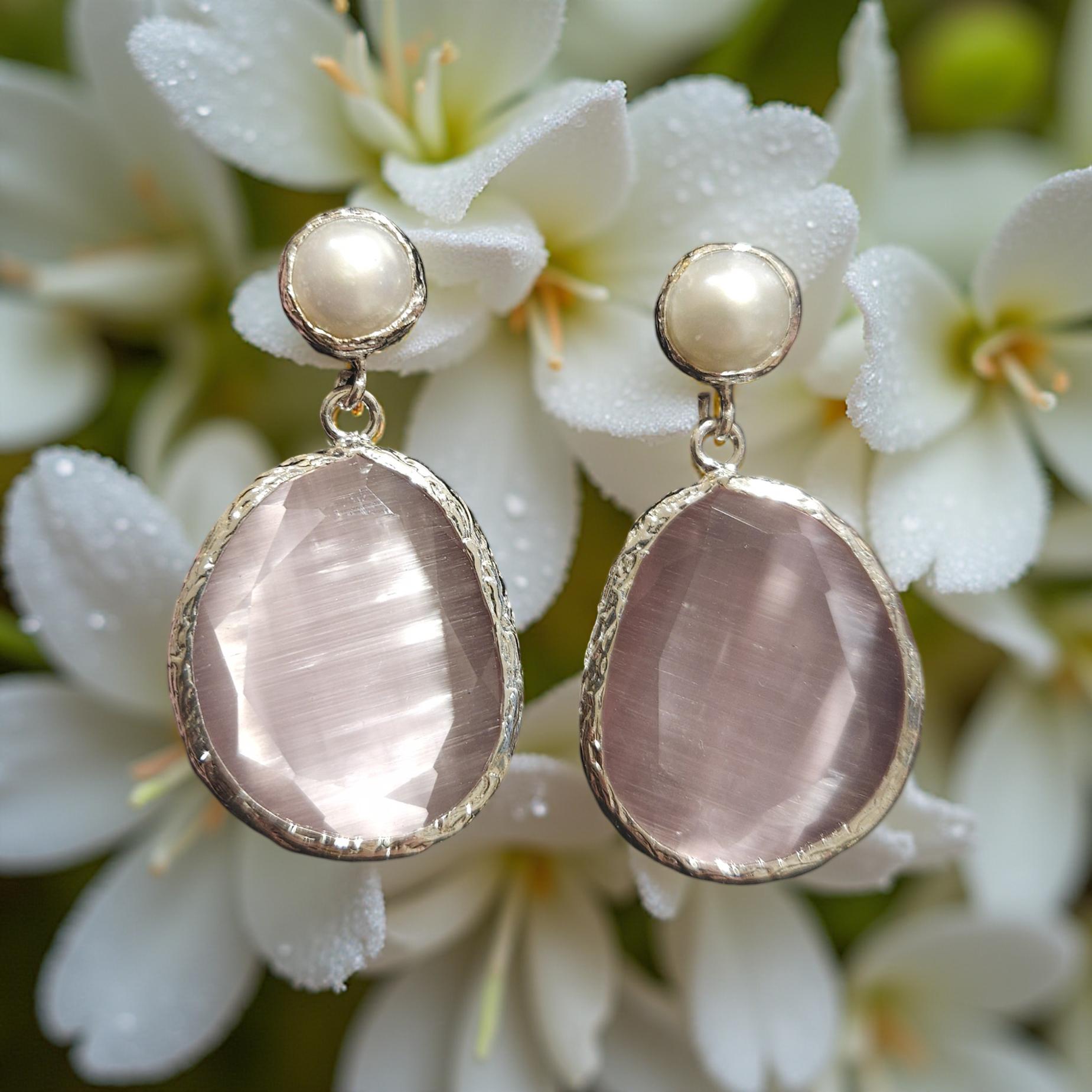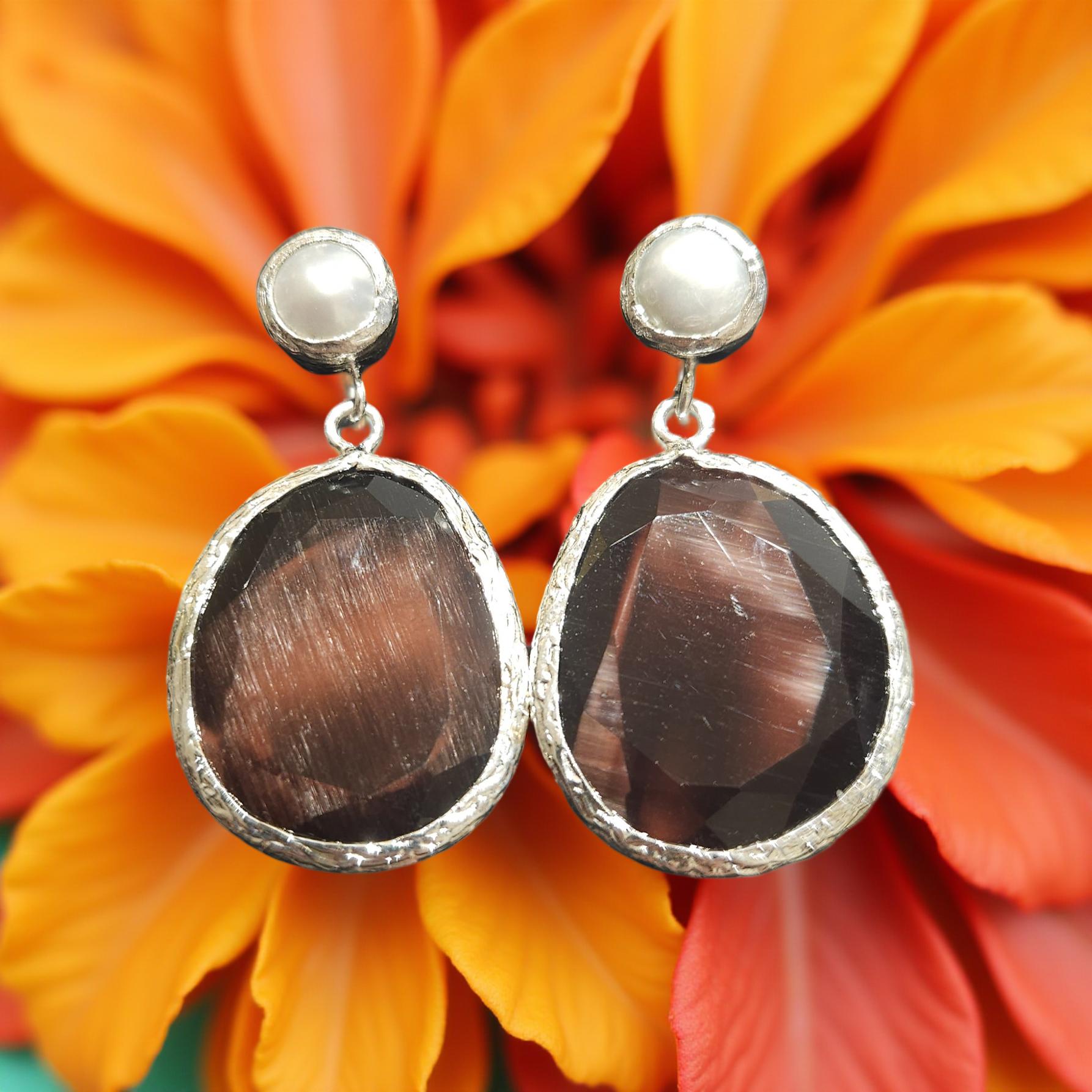 Ces boucles d'oreilles sophistiquées sont ornées de pierres œil de chat et de perles colorées qui ajoutent une touche de glamour à votre look. Fabriquées en laiton plaqué argent, elles allient élégance et qualité. Disponibles en plusieurs coloris pour s'adapter à tous les styles.
