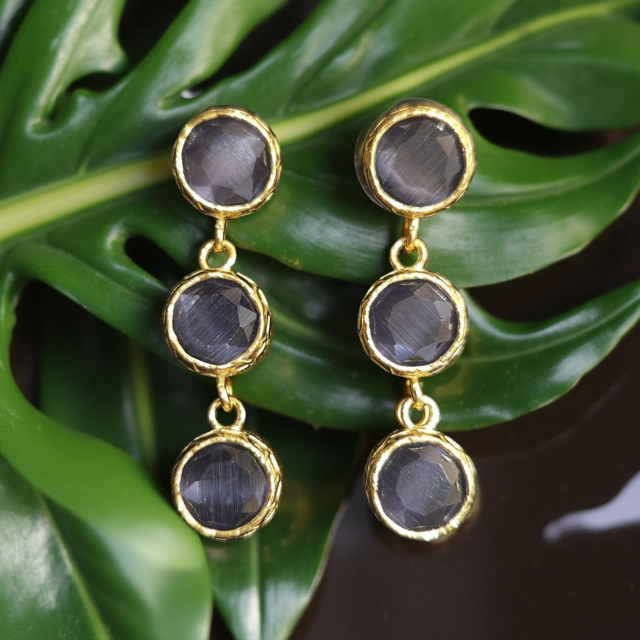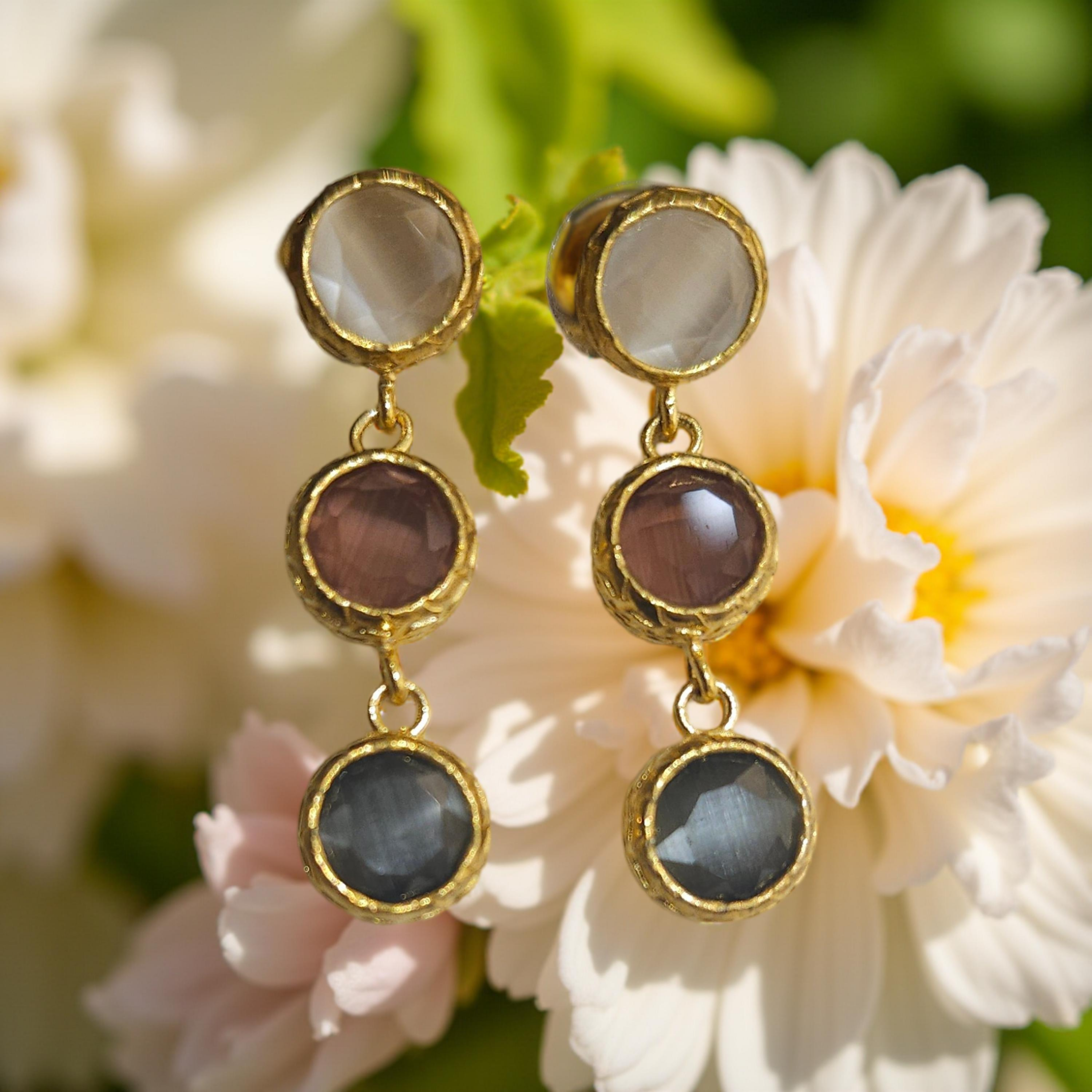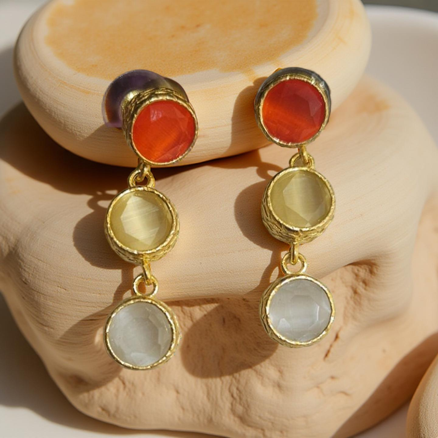 Ces boucles d'oreilles colorées en oeil de chat sont ornées de 3 pierres rondes pour une touche élégante et moderne. Mettez en valeur votre look avec cet accessoire tendance et unique.
