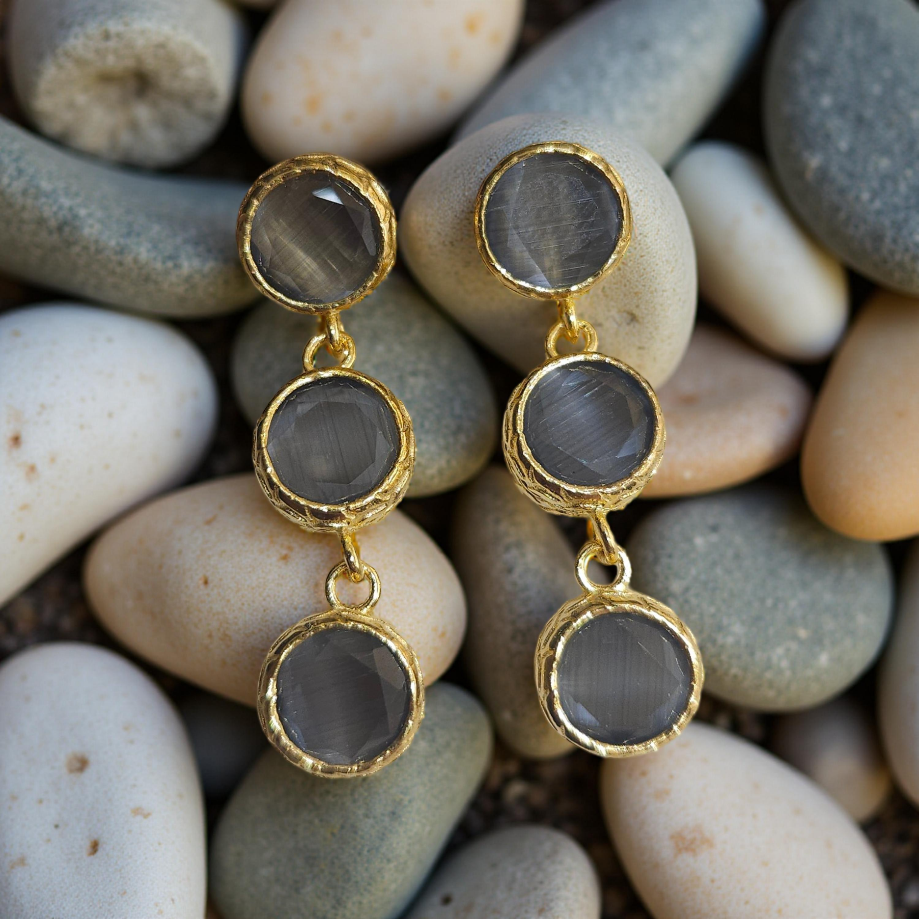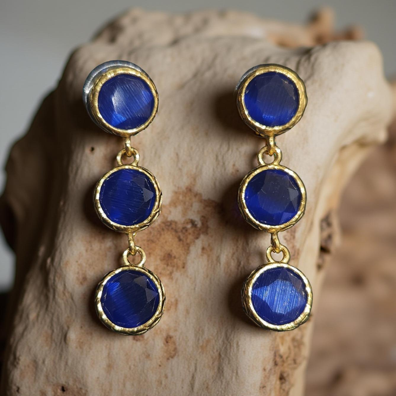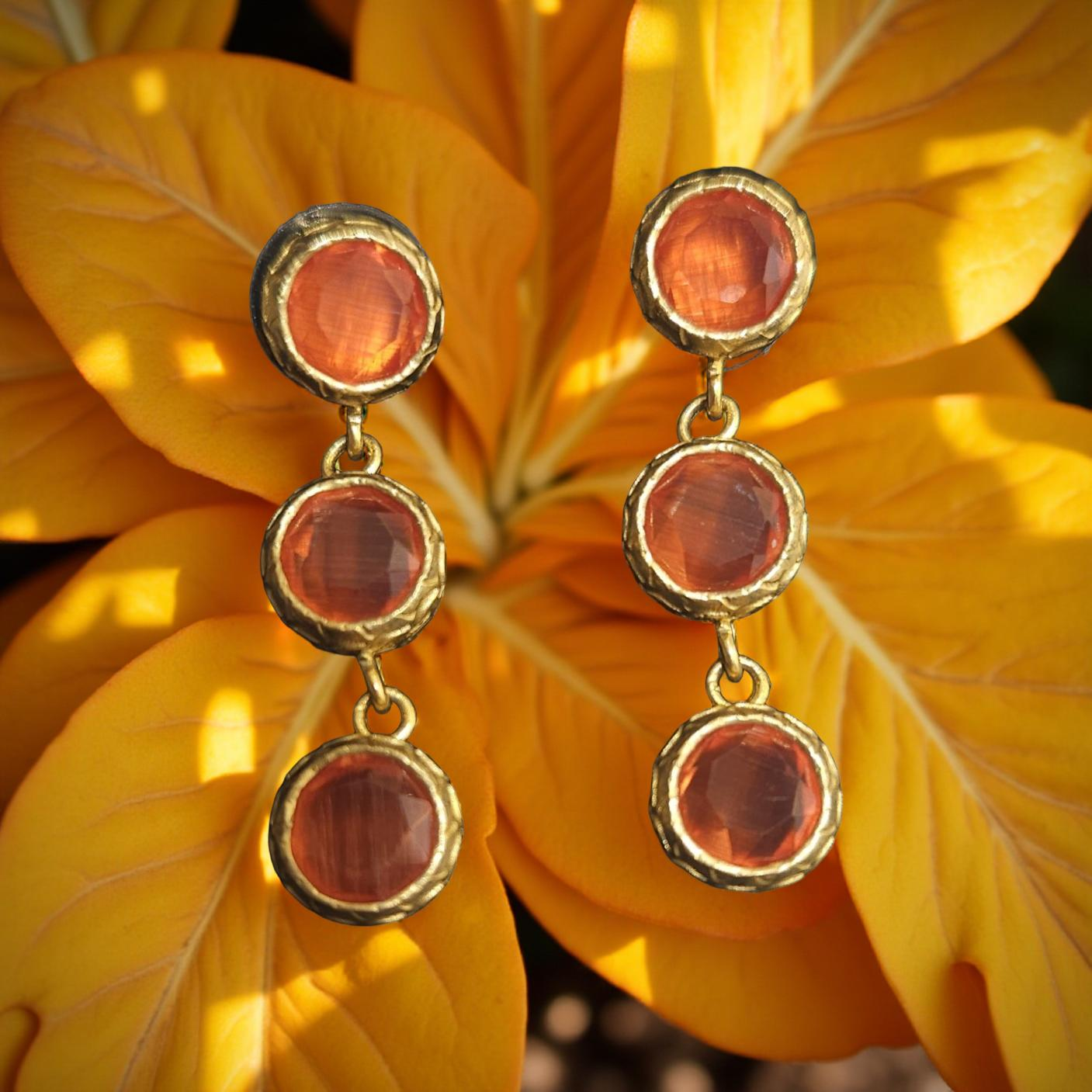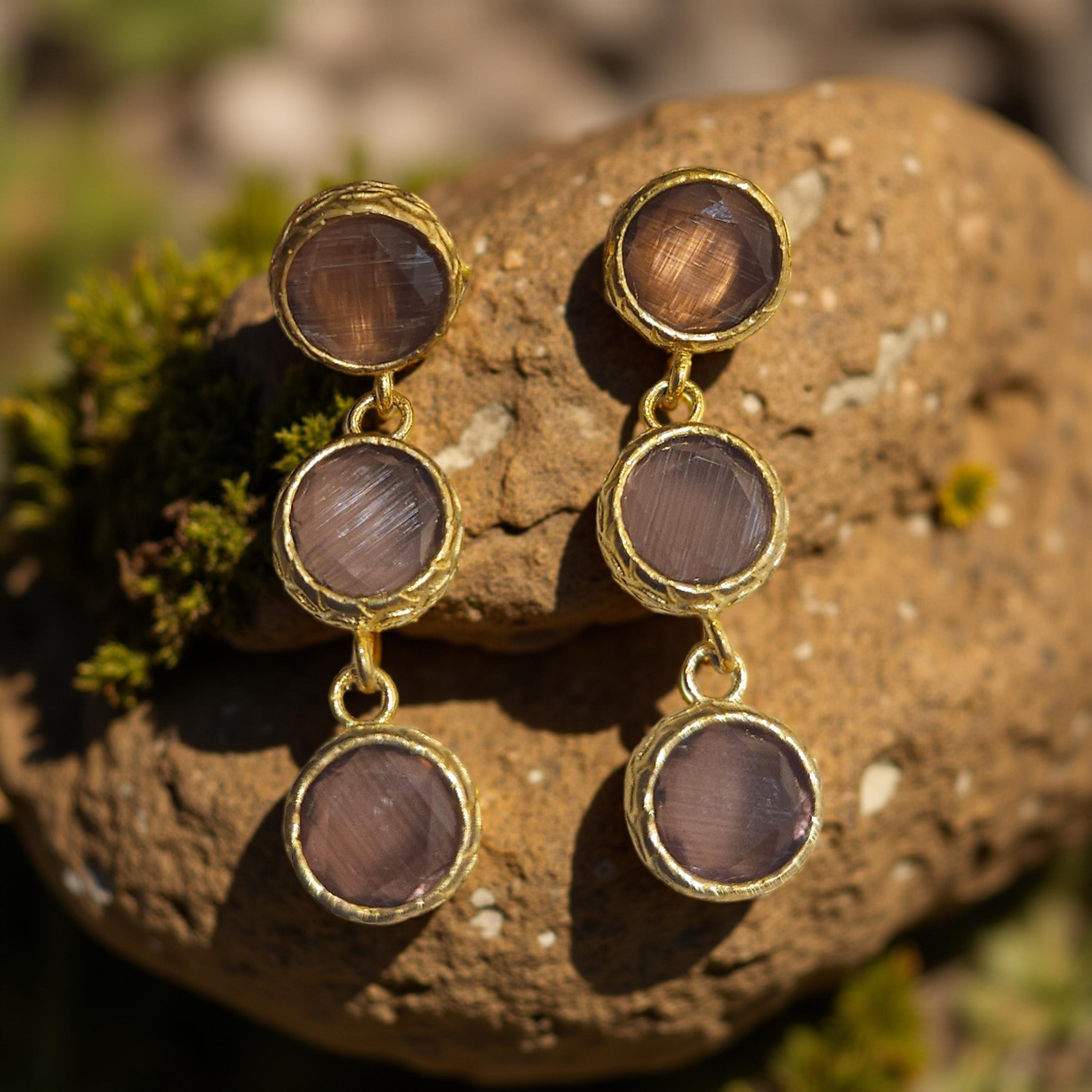 Ces boucles d'oreilles colorées en oeil de chat sont ornées de 3 pierres rondes pour une touche élégante et moderne. Mettez en valeur votre look avec cet accessoire tendance et unique.
