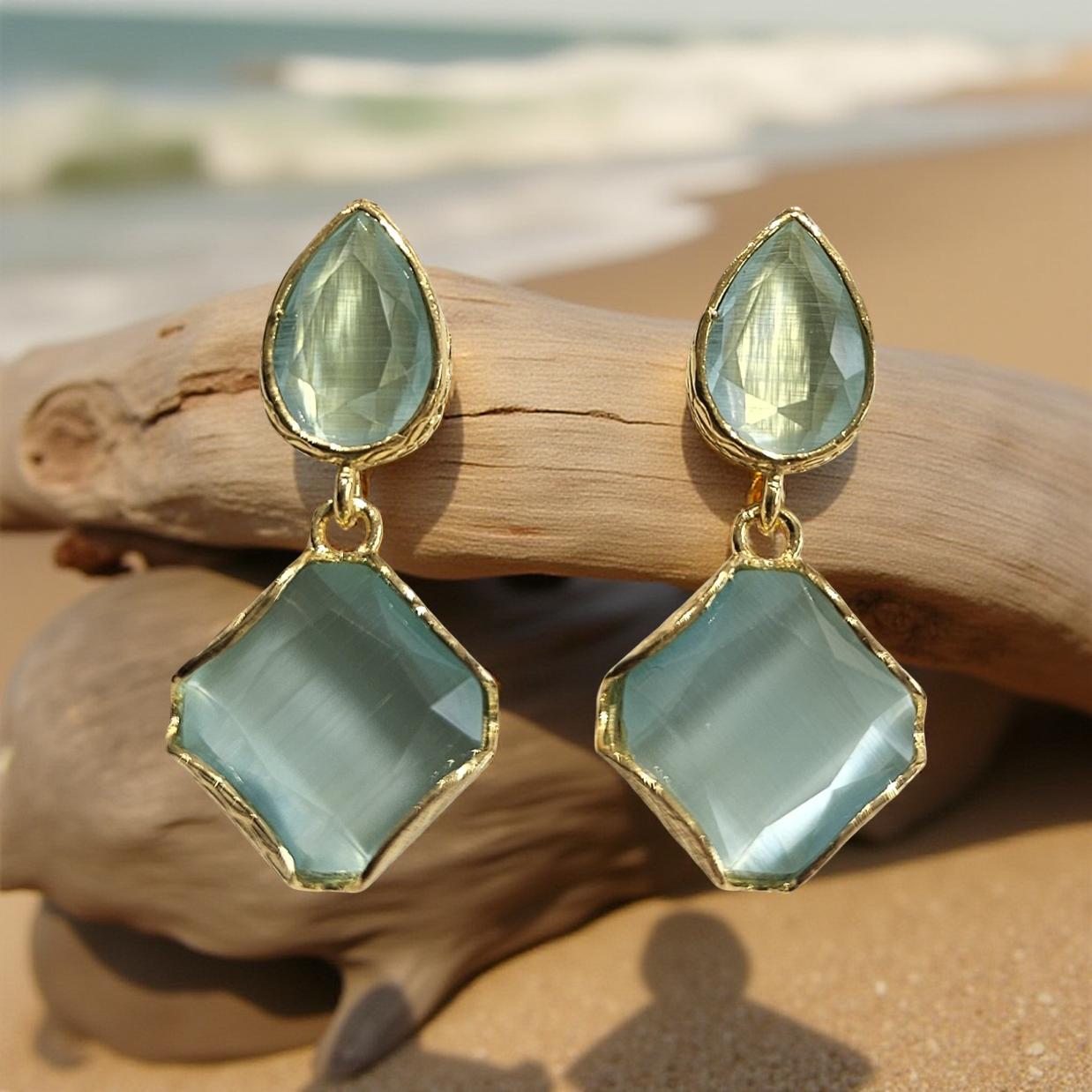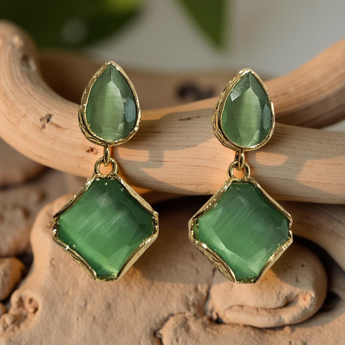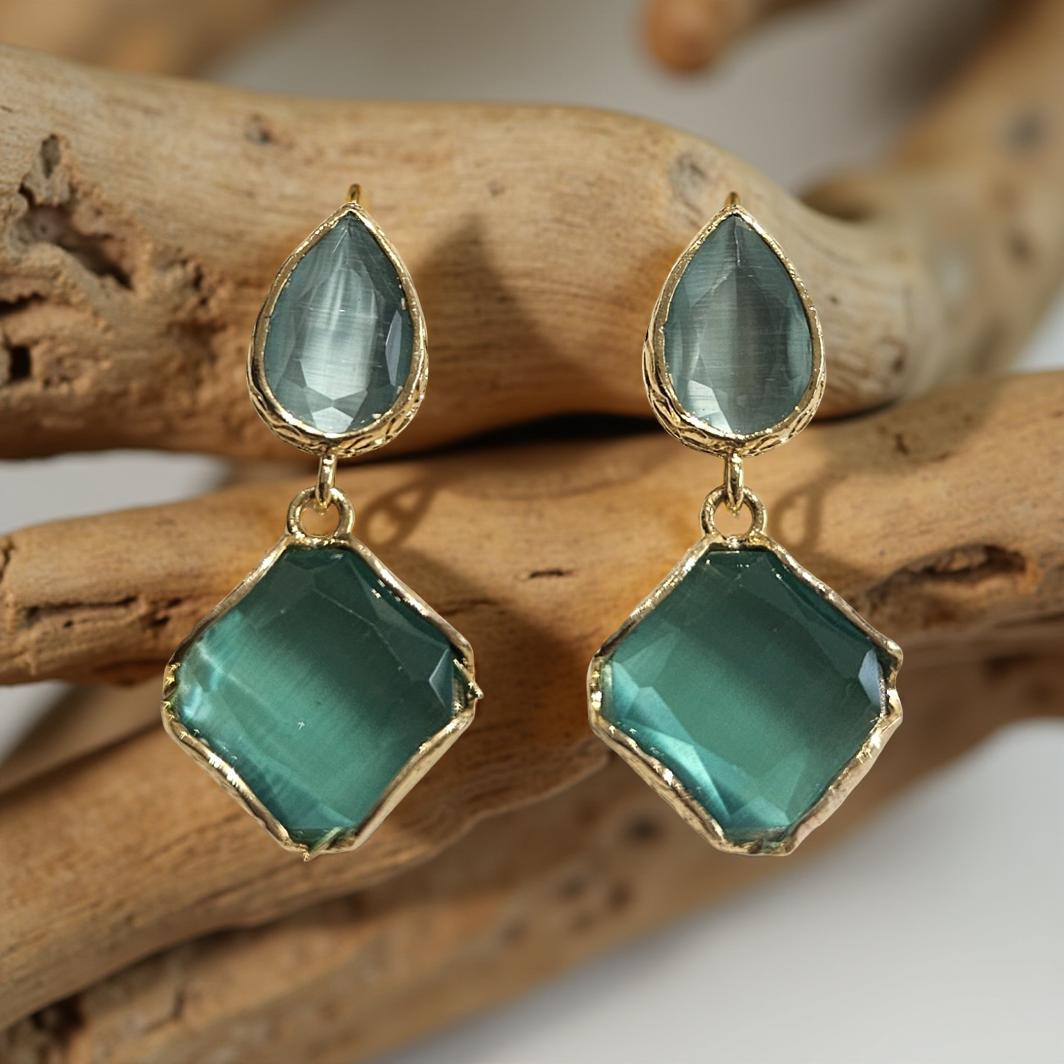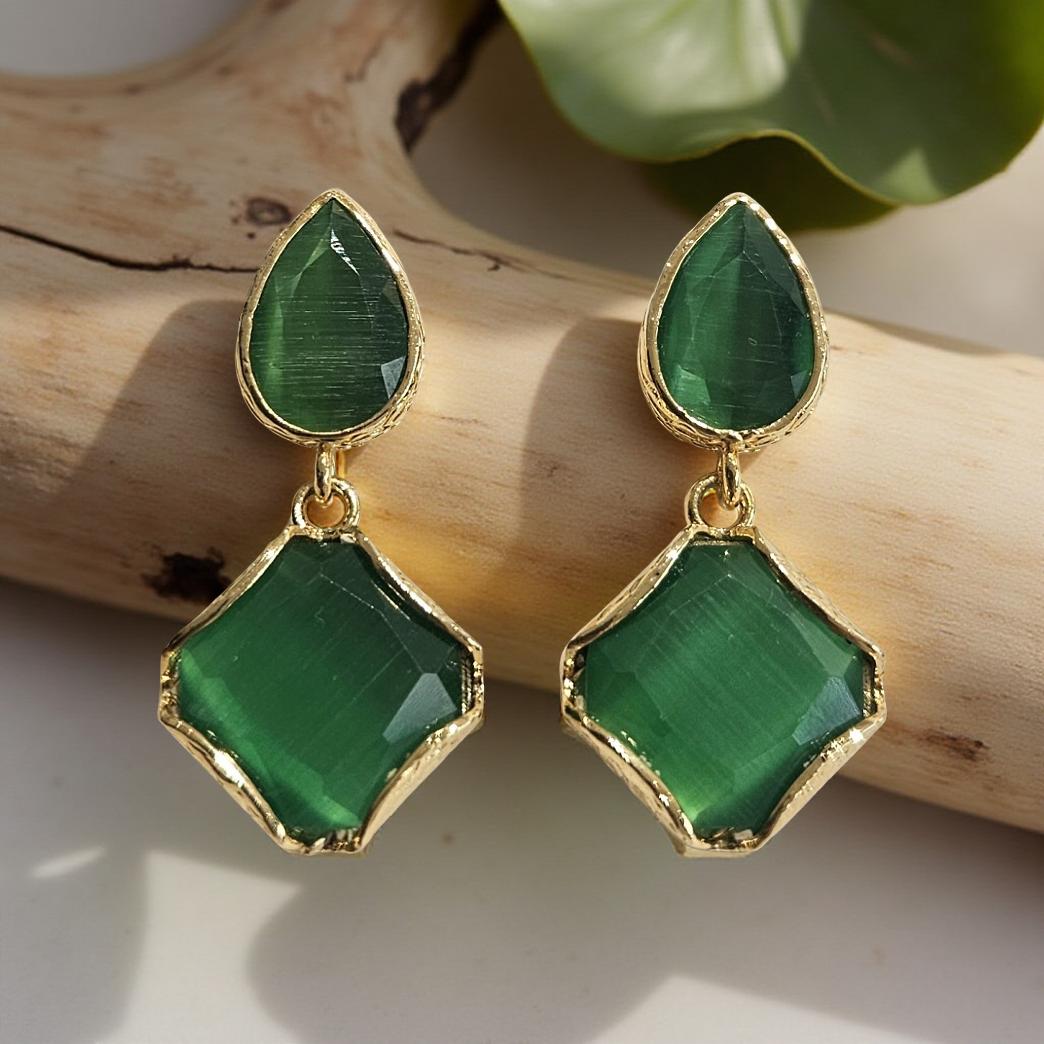 Découvrez nos magnifiques boucles d'oreilles en laiton plaqué or avec des pierres en oeil de chat. La forme goutte et losange ajoute de l'élégance à ces bijoux disponibles dans différentes couleurs. Ajoutez une touche de classe à votre tenue avec ces boucles d'oreilles uniques.