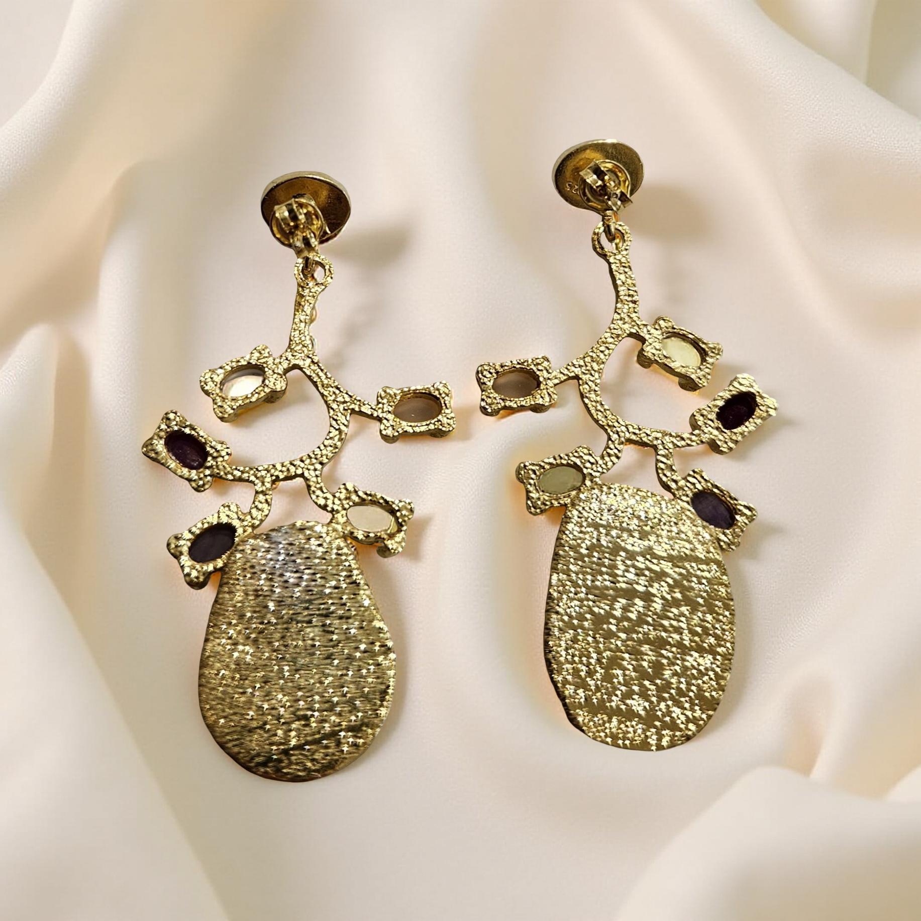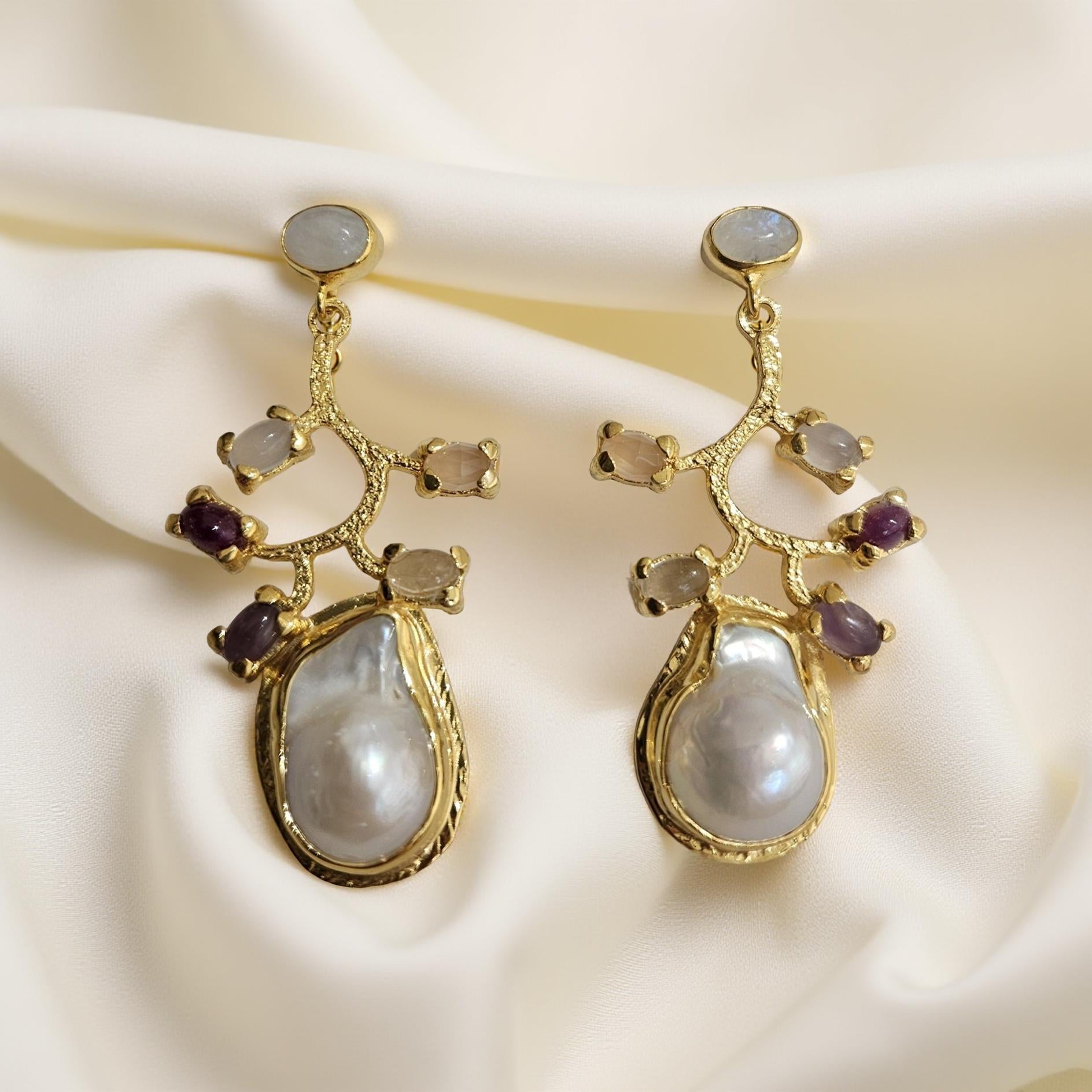 Découvrez ces magnifiques boucles d'oreilles en argent 925 plaqué or avec un design unique en forme de branches. Fabriquées à la main, elles sont ornées de pierres de lunes, de tourmaline et d'améthyste ainsi que de perles baroques pour un look élégant et original. Parfaites pour toutes occasions, ces boucles d'oreilles vous feront briller de mille feux.