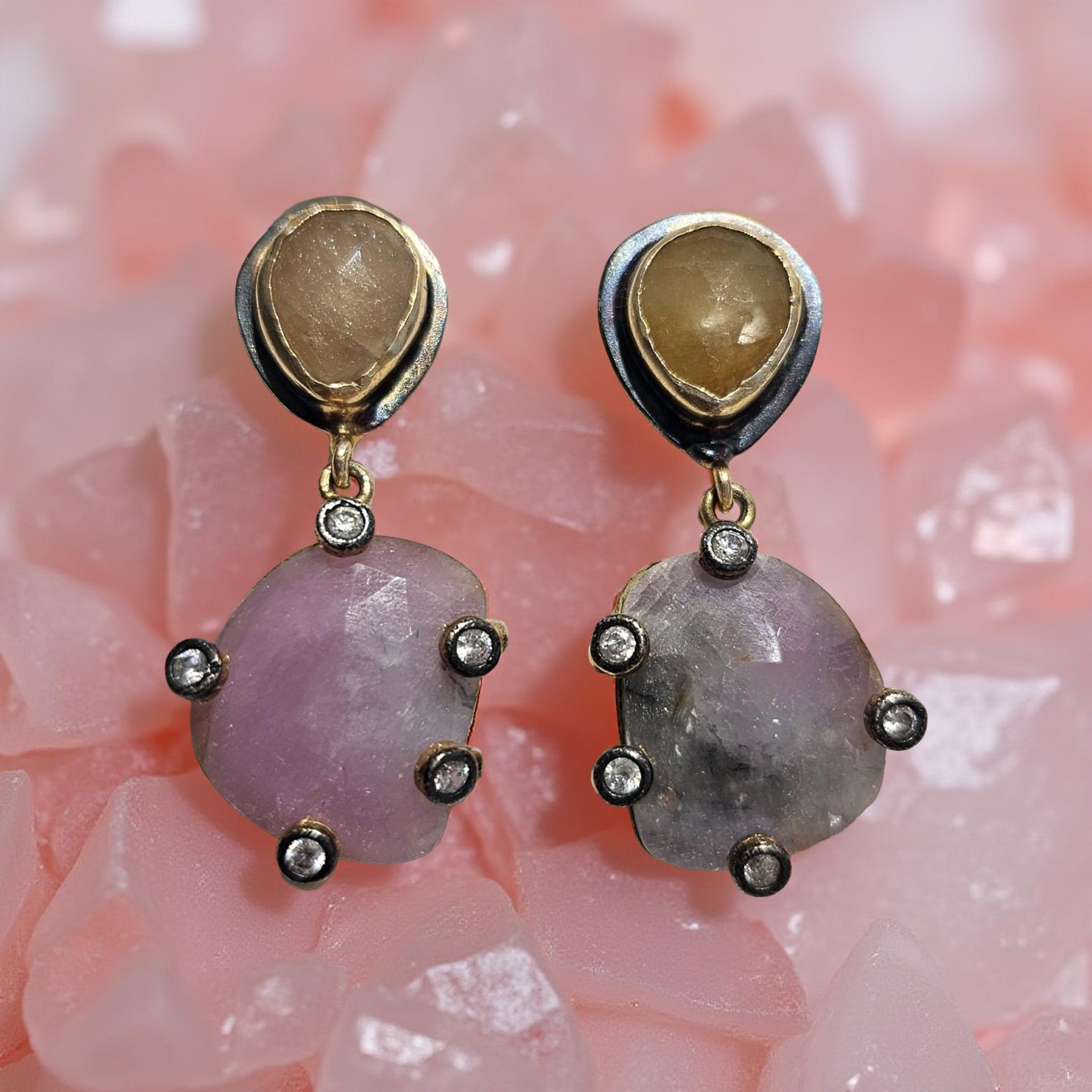 Ces boucles d'oreilles en argent 925 rhodié et plaqué or ornées de pierres saphir jaune et rose et de zirconium sont uniques en leur genre et sont fabriquées à la main. Profitez d'un design exclusif et d'une qualité inégalée pour sublimer votre style.