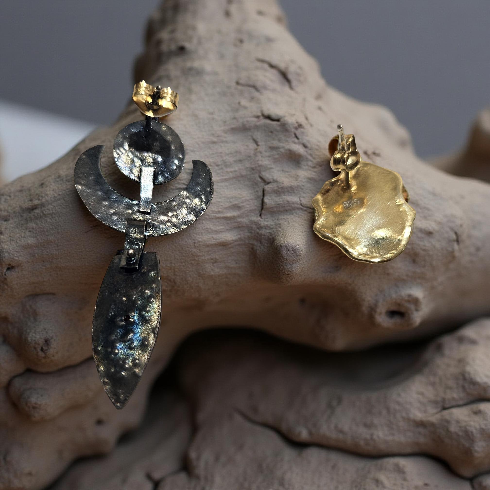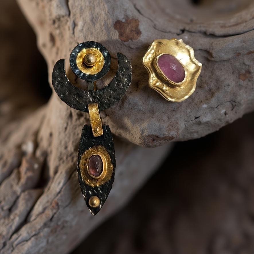 Boucles d'oreilles argent 925 rhodié, plaqué or, pierre tourmaline (ensemble dépareillé)