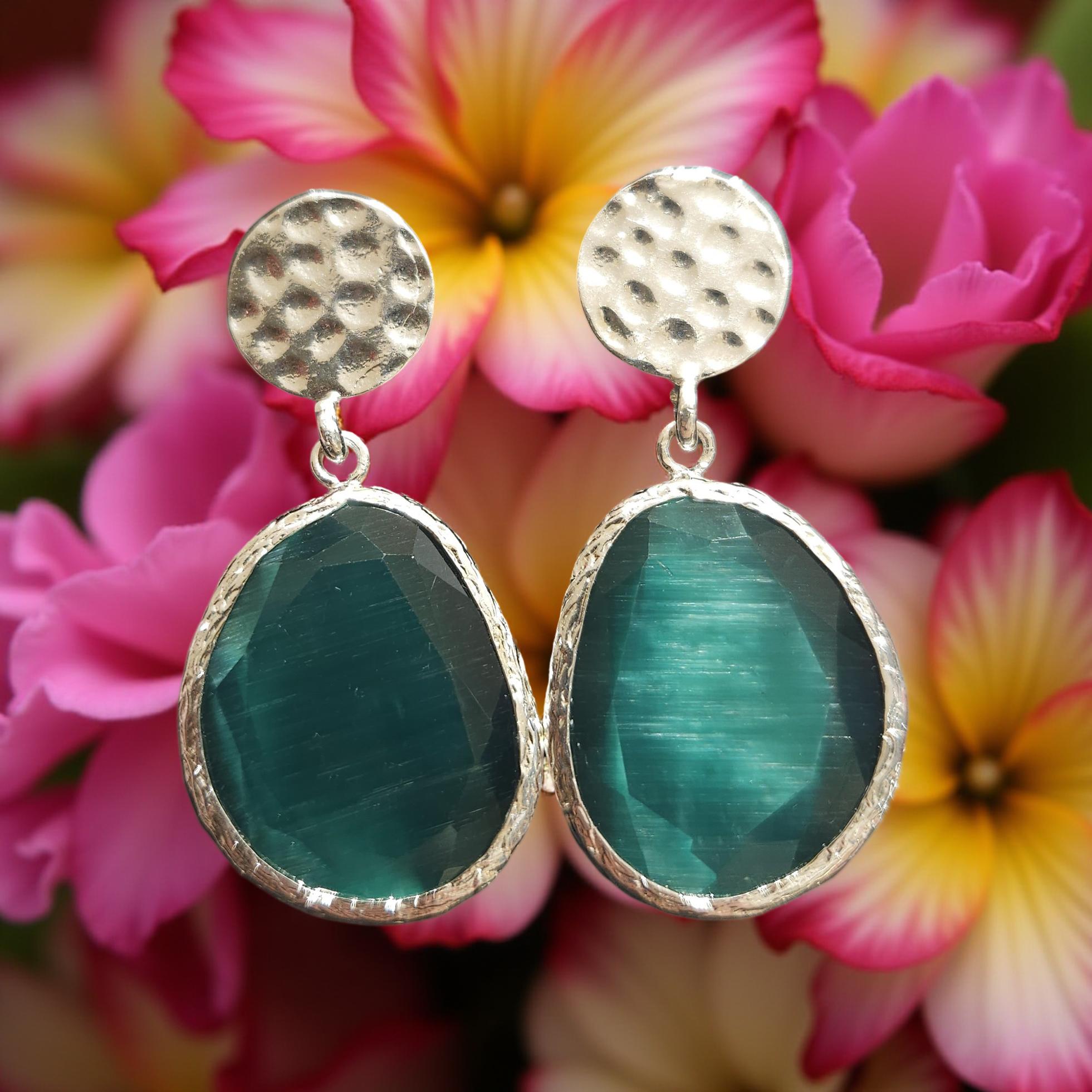 Ces boucles d'oreilles uniques sont ornées de pierres en œil de chat, symbolisant la protection et la clarté. Attachées à des puces en forme de ruche, elles ajoutent une touche d'originalité à toutes vos tenues. Disponibles en différentes couleurs pour s'adapter à votre style.